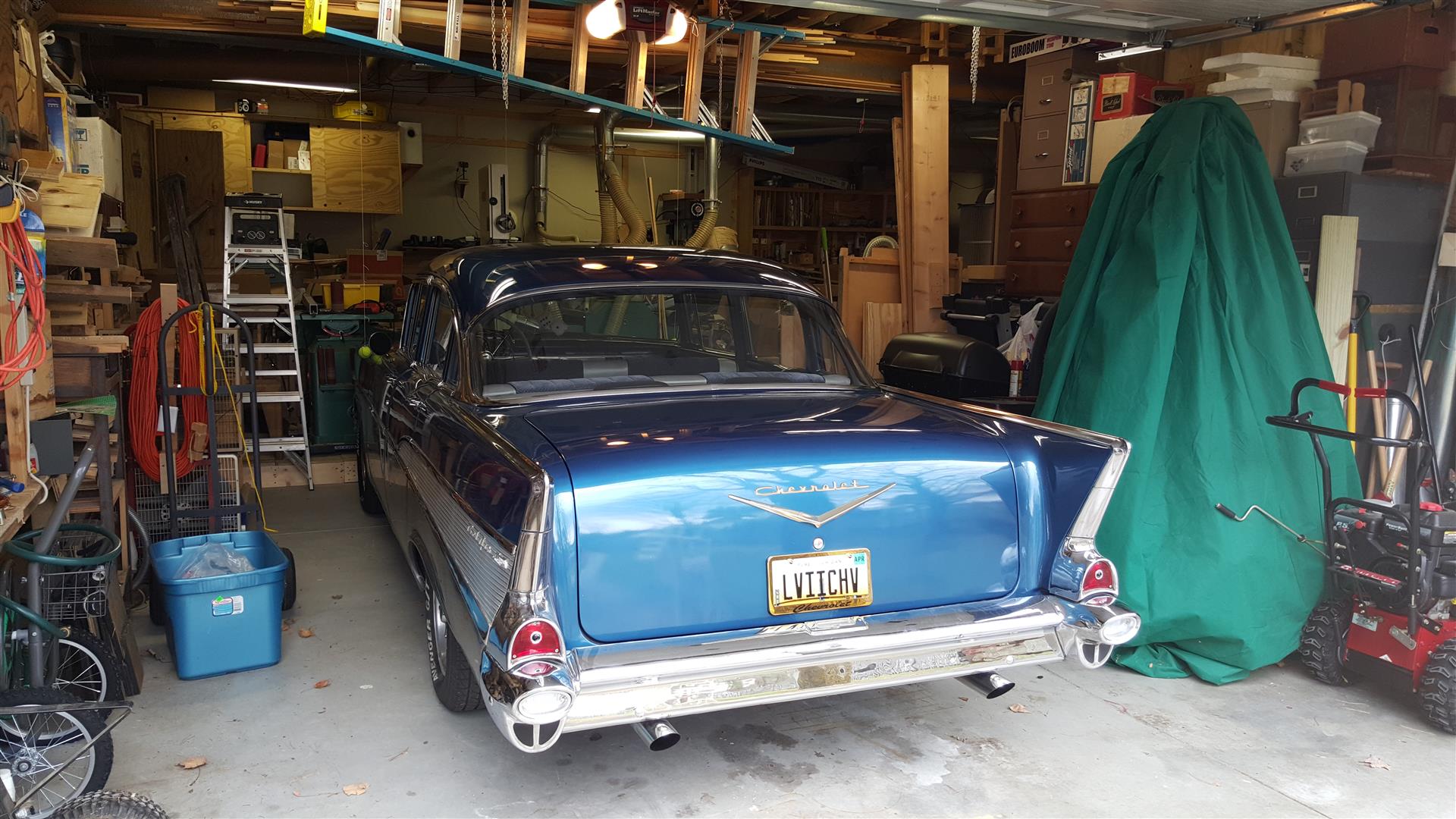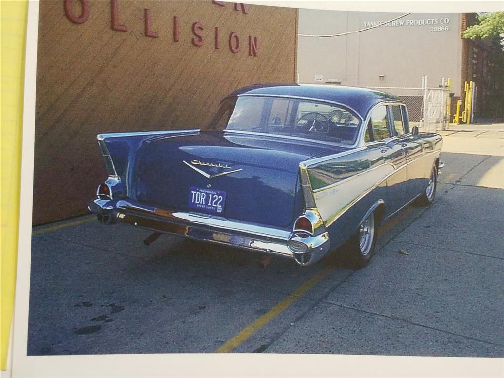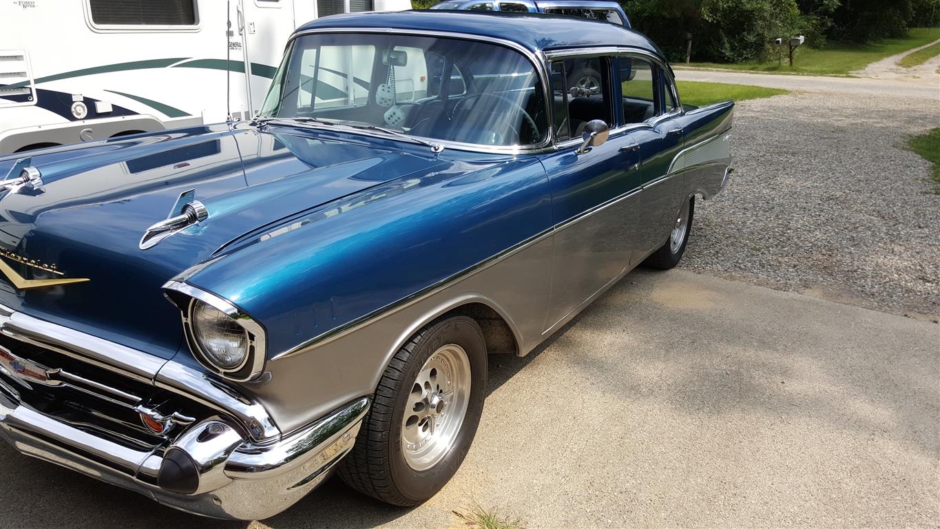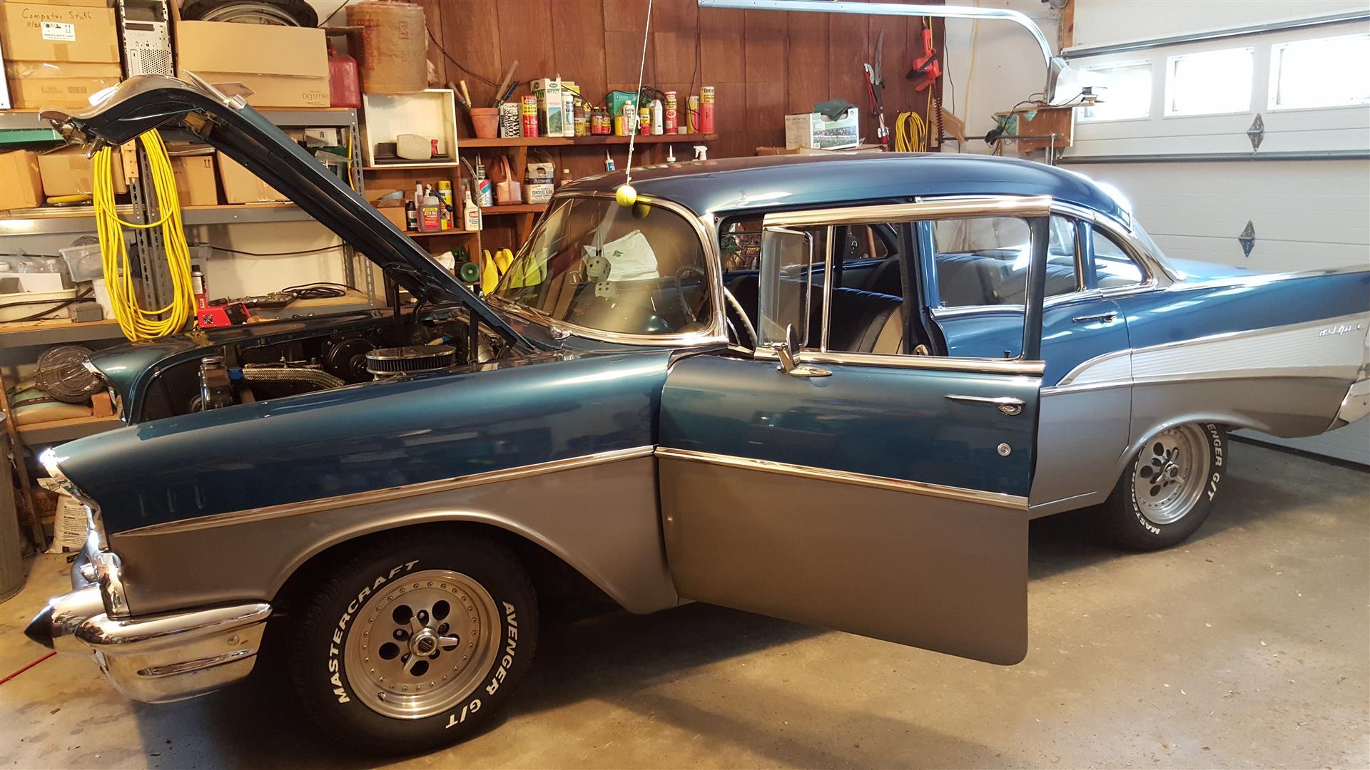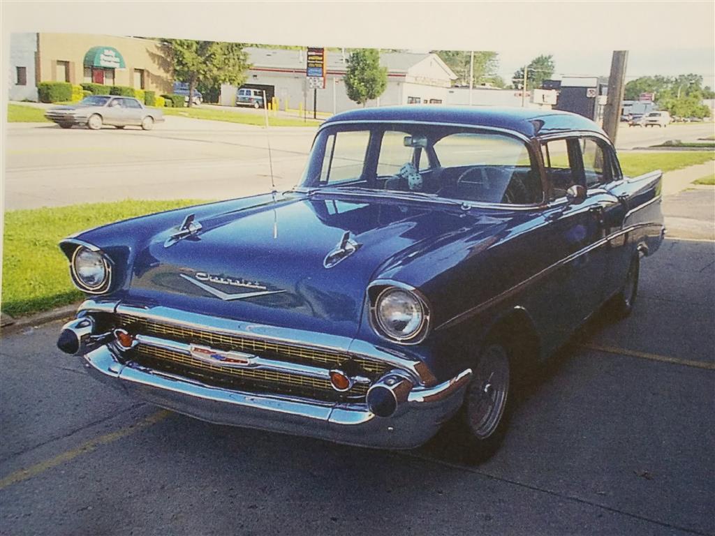 These are photos of our 1957 Chevy. The first sixteen photos document the 2005 replacement of a 283 engine and drive train with a 350 engine, drive train, and suspension changes. The photos 17 to 26 show the car's appearance when we purchased the car in Fall of 2015. Photos 27 to 33 show cosmetic changes. Photos 34 to 42 show the changes resulting from adding A/C to the Chevy. Photos 43 to 51 show more cosmetic changes. Photos 52 to 53 show winter storage area. Photos 54 to 107 show body work, painting, and some other cosmetic changes. Photos 108 to 117 show more cosmetic changes. After a brief drive in June of 2016, it became apparent that additional cooling was required, also during this run a severe clatter started in the engine. Photos 118 - 119 show the new BeCool radiator being installed. The clatter was discoverd to be a broken valve spring. Photos 120 to 123 show this problem. After replacing all the valve, inner and outer, springs, we hope that the problem is cured for a long time. Photos 124 to 131 show the solution to the 57 Chevy heating problem when going under 15 mph. Photos 132 to 134 show a problem with A/C condenser coming loose from the radiator and its repair. Photos 135 to 137 show the sound system power supply used at car shows. Photo 138 shows a new overflow tank and battery tray. Photos 139 to 141 show the appearance of the 57 Chevy in 1987. Photos 142 to 145 show the new headlights and the buckets they sit in when on the 57 Chevy. Photos 146 to 152 show new bucket seats and beginning of Center Console. Lost glove box space when AC added. Center Console will return glove box space and provide BackUp Camera, cup holders, and switches for cooling fans on radiator, BackUp Lights(column switch broken no correct replacement available), USB ports, 12 v power point, and any other switches needed. Photos 153 to 160 show the progress of the center console to it's completion. Photos 161 to 164 show the center console in our 57 Chevy. Photos 165 to 168 show the couch made from the front bench seat from the 57 Chevy. Photos 169 to 172 show the finished center console.