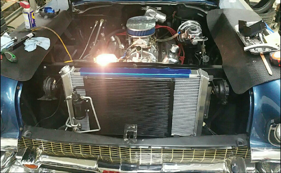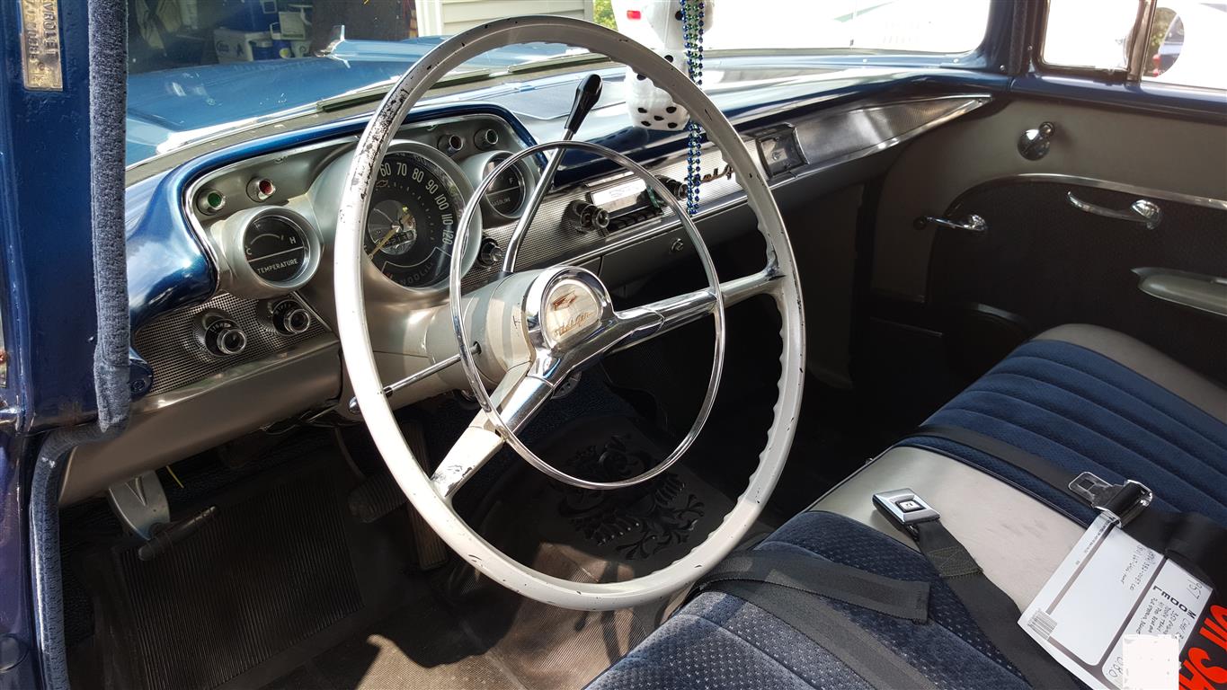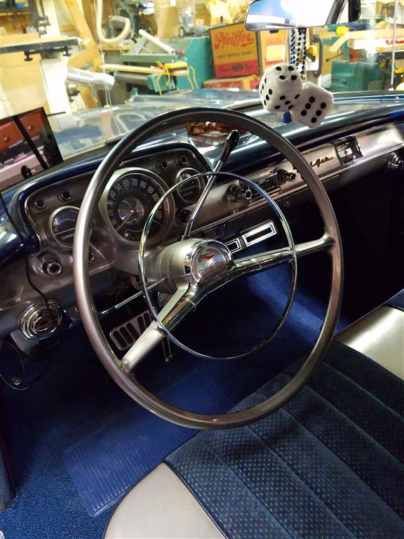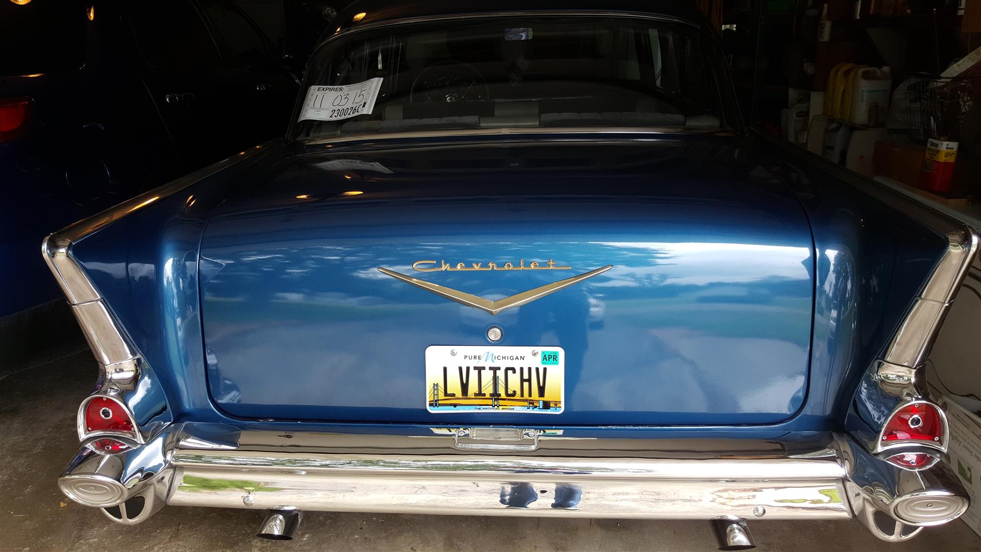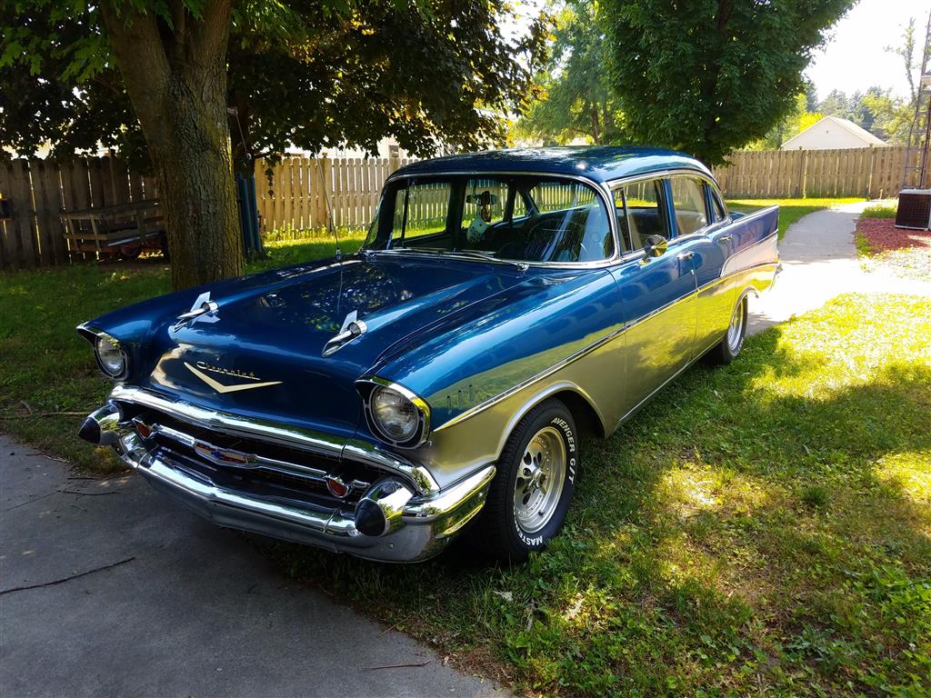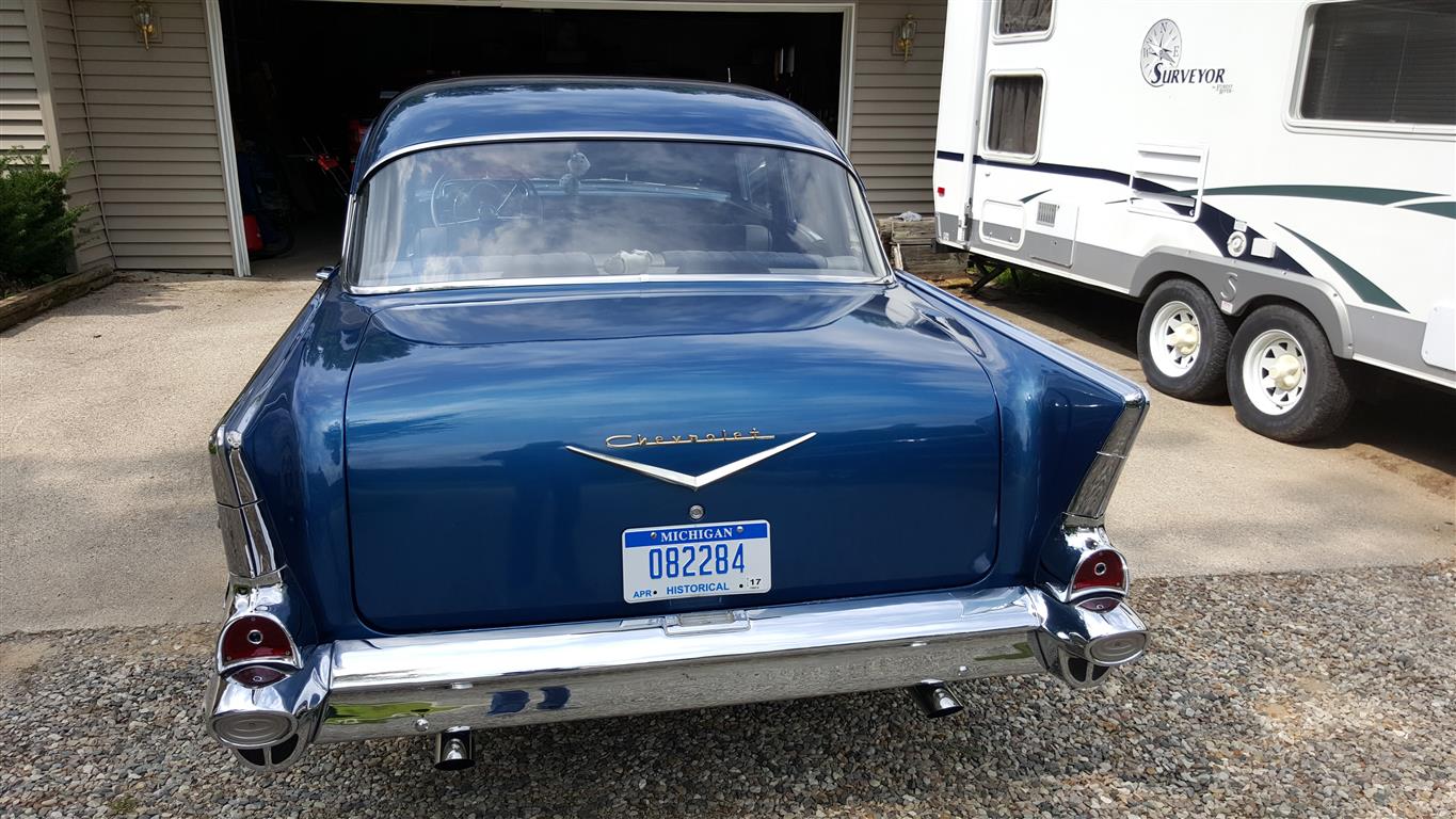 These are photos of our 1957 Chevy. The first sixteen photos document the 2005 replacement of a 283 engine and drive train with a 350 engine, drive train, and suspension changes. The photos 17 to 26 show the car's appearance when we purchased the car in Fall of 2015. Photos 27 to 33 show cosmetic changes. Photos 34 to 42 show the changes resulting from adding A/C to the Chevy. Photos 43 to 51 show more cosmetic changes. Photos 52 to 53 show winter storage area. Photos 54 to 107 show body work, painting, and some other cosmetic changes. Photos 108 to 117 show more cosmetic changes. After a brief drive in June of 2016, it became apparent that additional cooling was required, also during this run a severe clatter started in the engine. Photos 118 - 119 show the new BeCool radiator being installed. The clatter was discoverd to be a broken valve spring. Photos 120 to 123 show this problem. After replacing all the valve, inner and outer, springs, we hope that the problem is cured for a long time. Photos 124 to 131 show the solution to the 57 Chevy heating problem when going under 15 mph. Photos 132 to 134 show a problem with A/C condenser coming loose from the radiator and its repair. Photos 135 to 137 show the sound system power supply used at car shows. Photo 138 shows a new overflow tank and battery tray. Photos 139 to 141 show the appearance of the 57 Chevy in 1987. Photos 142 to 145 show the new headlights and the buckets they sit in when on the 57 Chevy. Photos 146 to 152 show new bucket seats and beginning of Center Console. Lost glove box space when AC added. Center Console will return glove box space and provide BackUp Camera, cup holders, and switches for cooling fans on radiator, BackUp Lights(column switch broken no correct replacement available), USB ports, 12 v power point, and any other switches needed. Photos 153 to 160 show the progress of the center console to it's completion. Photos 161 to 164 show the center console in our 57 Chevy. Photos 165 to 168 show the couch made from the front bench seat from the 57 Chevy. Photos 169 to 172 show the finished center console.