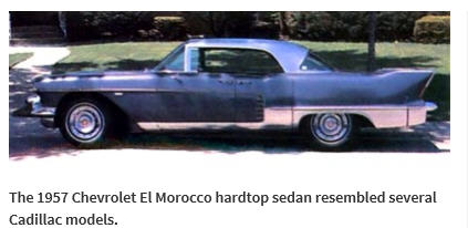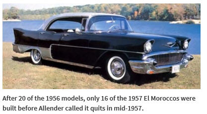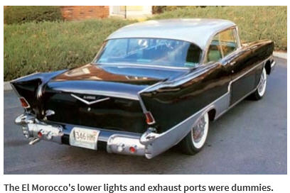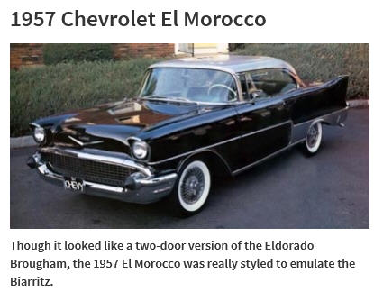 Two aspiring auto makers – Rueben Allender and Cyril Olbrich – decided to produce a vehicle that was fit for Cadillac lovers by modifying 1956 and 1957 Chevrolets. Their goal was to offer a luxurious but lower priced custom vehicle. The two bought new Chevrolet convertibles for $50 over dealer cost then they converted about 20-27 into rough estimation of a Cadillac Eldorado, thus the first version of the El Morocco. 1956 El Morocco’s sold for $3,250 each which included two door hardtops, four door hardtops, and convertibles. In 1957 only 10 El Morocco’s were produced before Allender and Olbrich had a falling out over financing and work conditions. Some of the modifications included 1955 Dodge tail lamps, modified Chevy hood ornament, bumper bullets made up of old Dodge headlight shells turned backward, and Willys fin moldings. The ’57 grille was made of stainless steel, tail light lenses came from a ’56 Plymouth and rear bumper bullets were made up from ’54 Mercury’s. Somewhere between 20 to 37 El Morocco’s are known to have been produced with a few of those left in existence. Needless to say these vehicles are rare if not almost extinct and highly desirable among collector car enthusiasts.