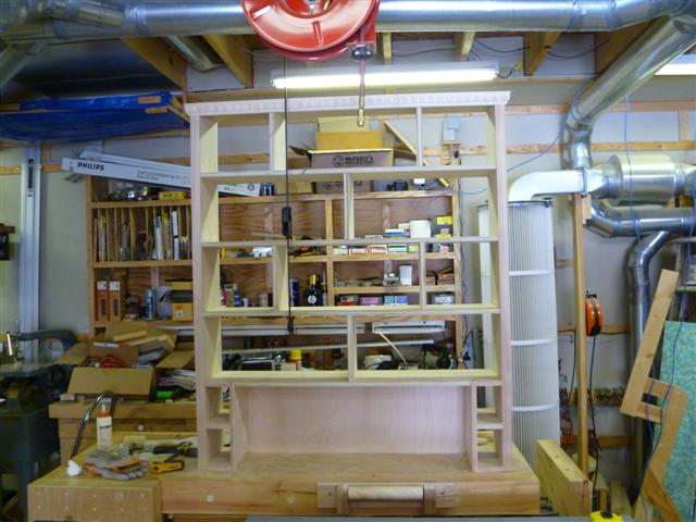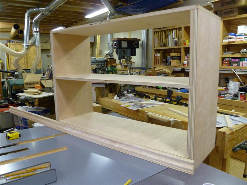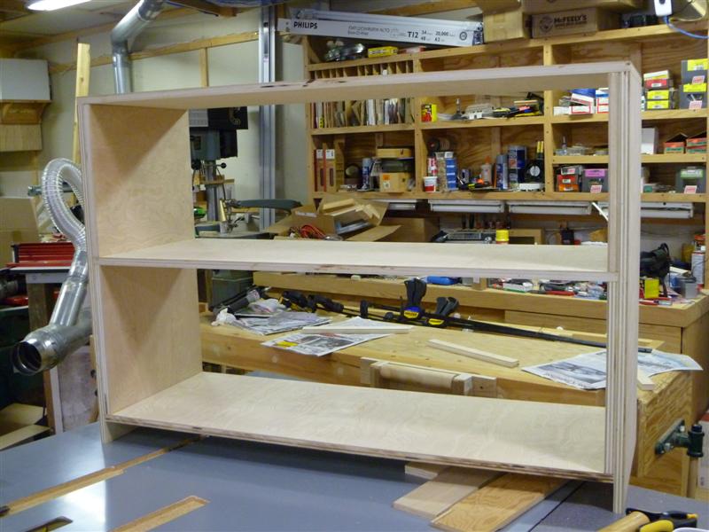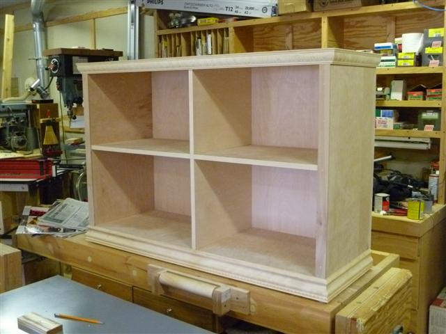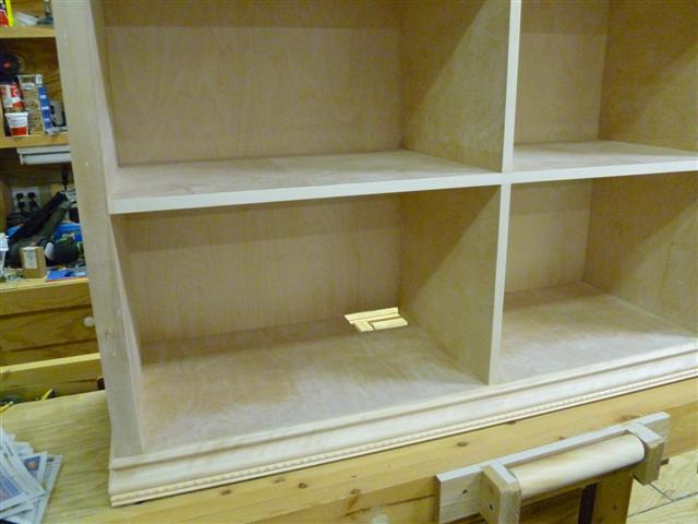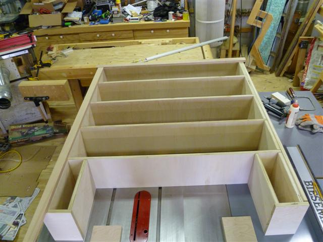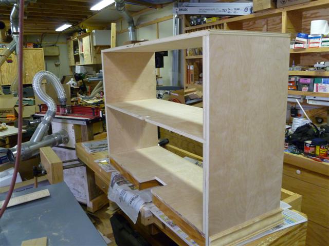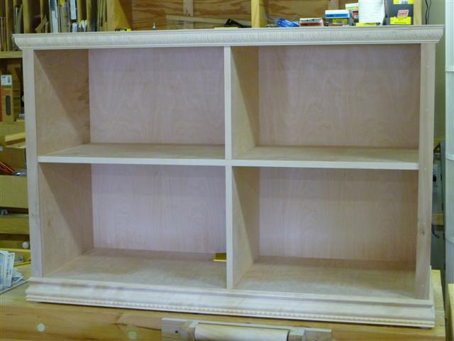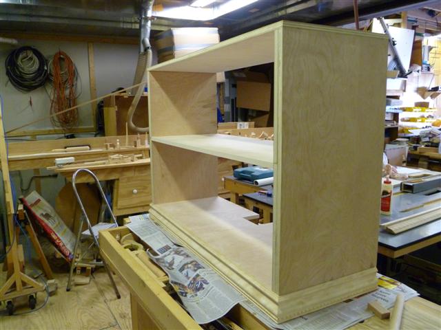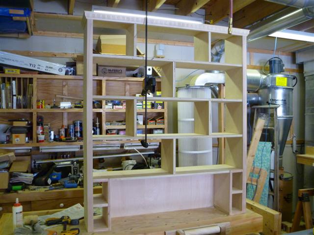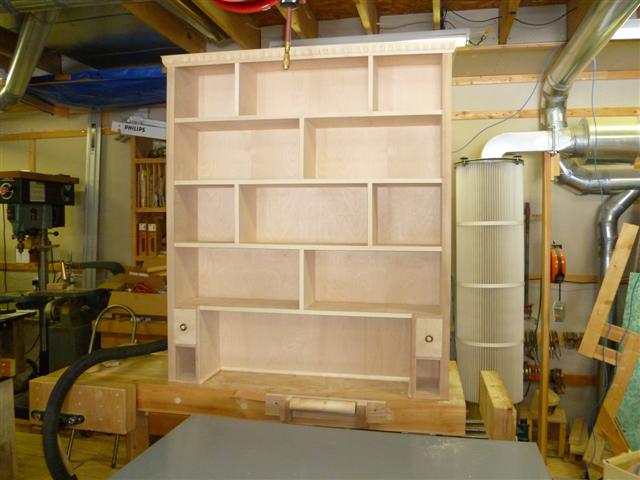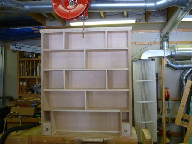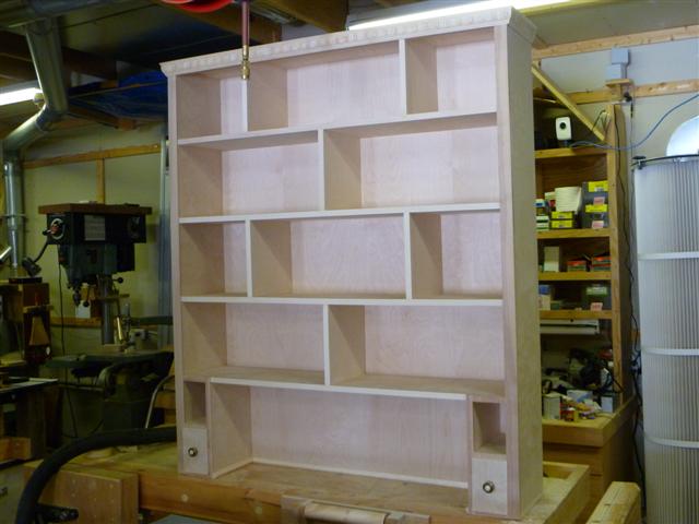 The bookcase is constructed of birch plywood. The bookcase is 48" wide, top 10" deep, bottom 16" deep, and 91" tall. The bottom of the case is 48" wide, 16" deep and 31" tall, with one shelf creating two openings. The top of the case is 10" deep, 48" wide, 60: tall, with four shelves having small drawers at the bottom of the top on either side. After the views of the bookcase, there are views of what happens when a person has too little to do to keep them productively occupied.