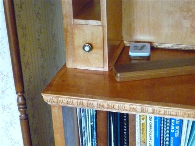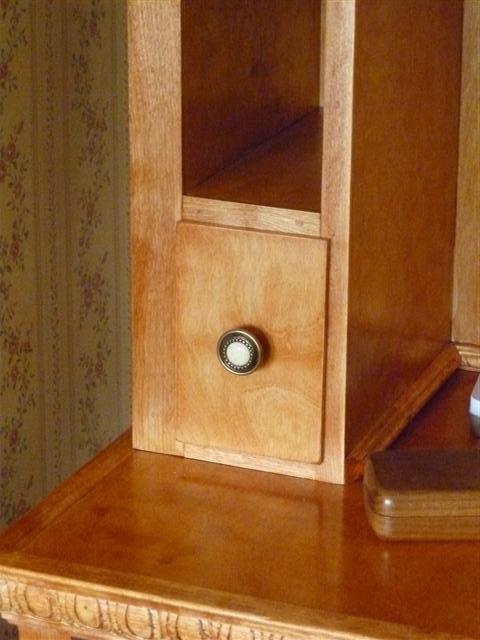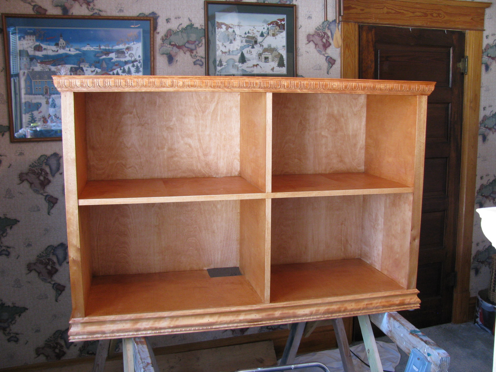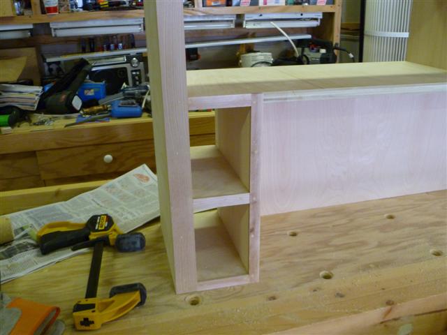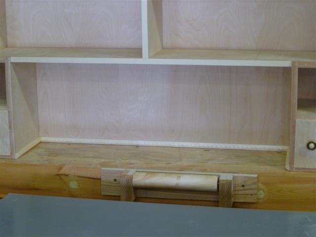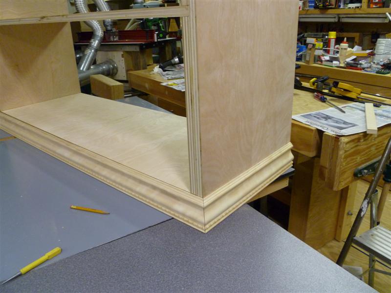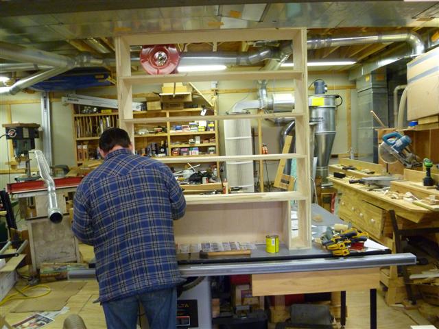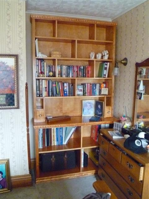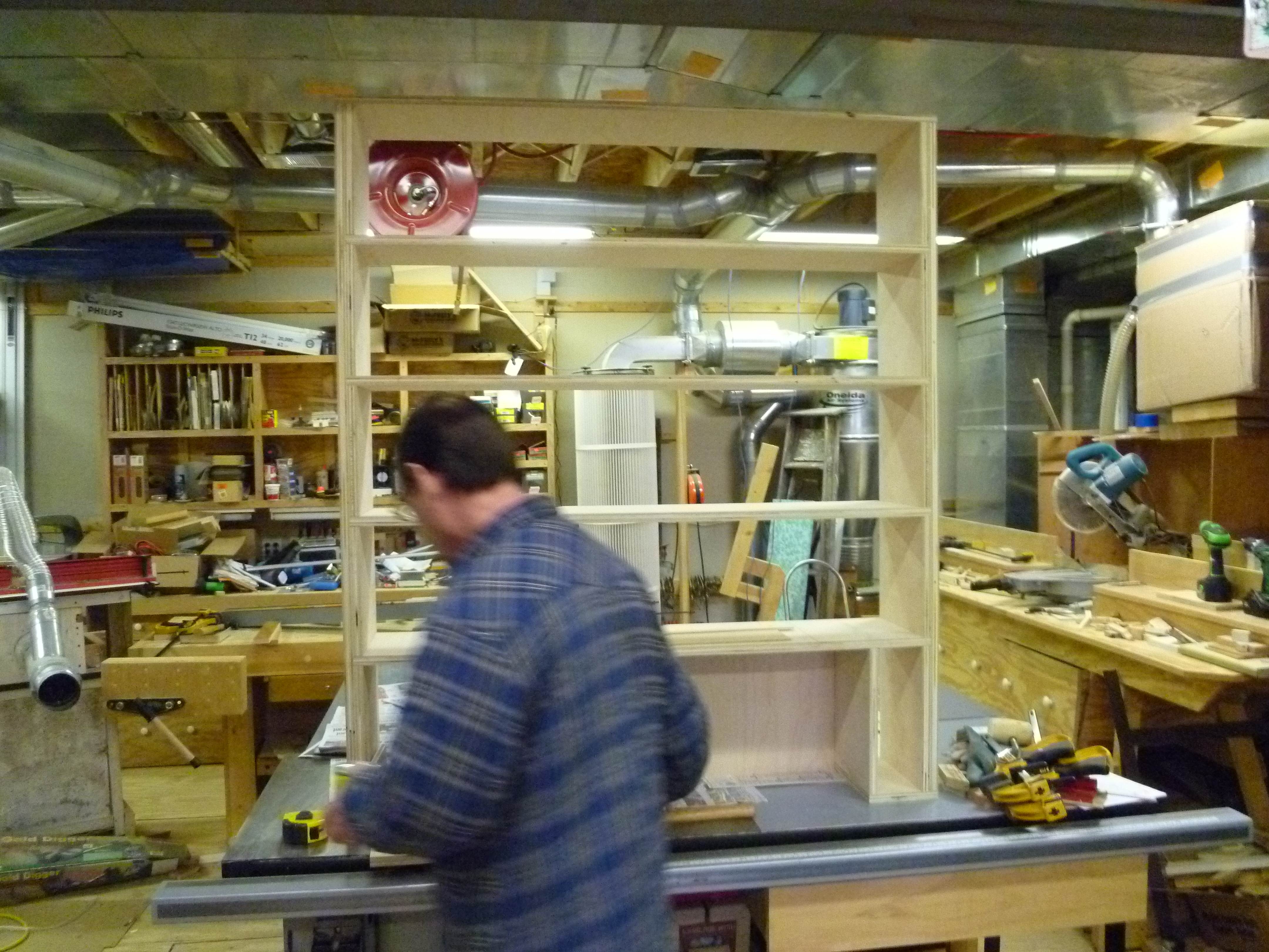 The bookcase is constructed of birch plywood. The bookcase is 48" wide, top 10" deep, bottom 16" deep, and 91" tall. The bottom of the case is 48" wide, 16" deep and 31" tall, with one shelf creating two openings. The top of the case is 10" deep, 48" wide, 60: tall, with four shelves having small drawers at the bottom of the top on either side. After the views of the bookcase, there are views of what happens when a person has too little to do to keep them productively occupied.