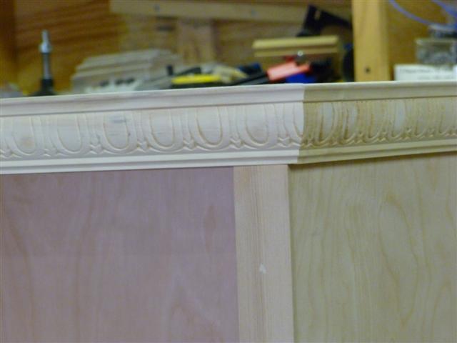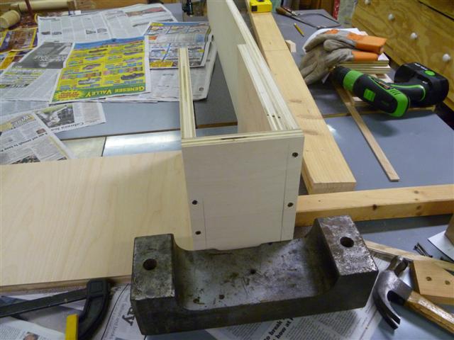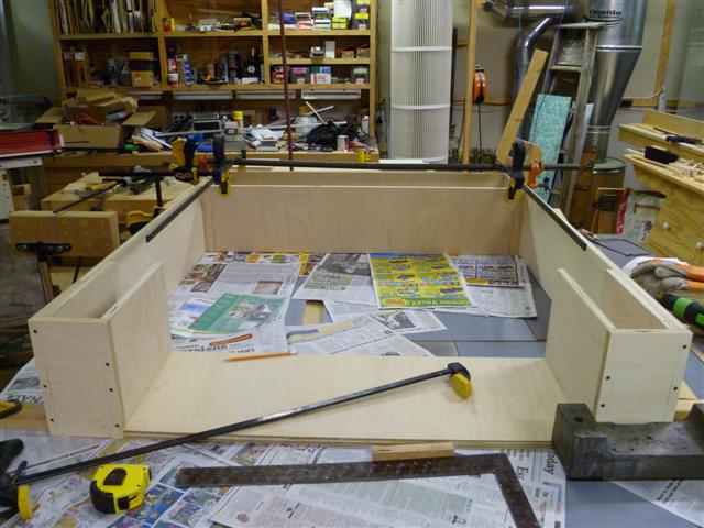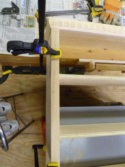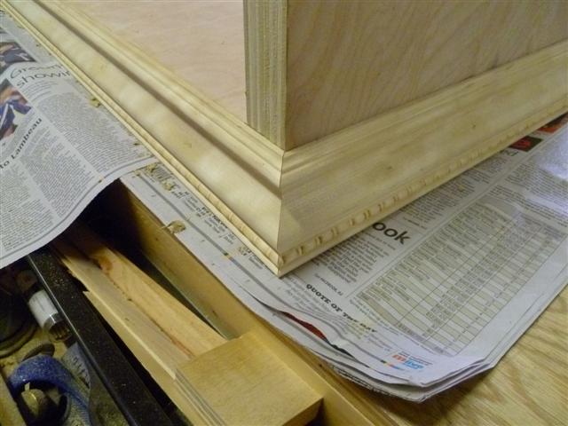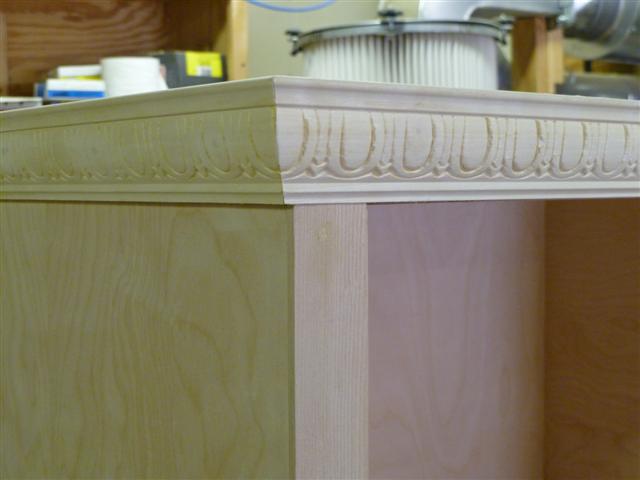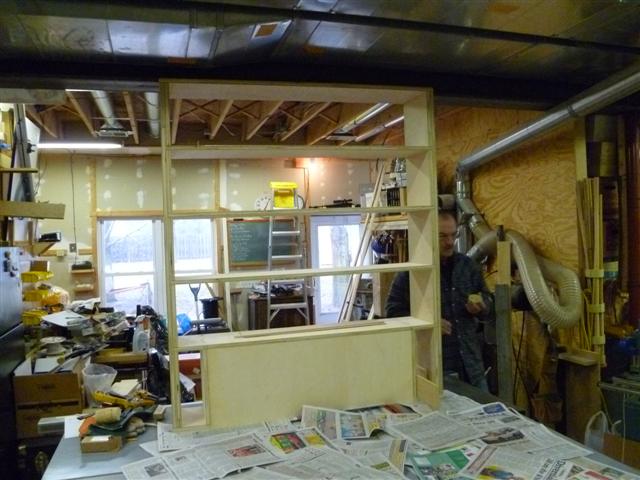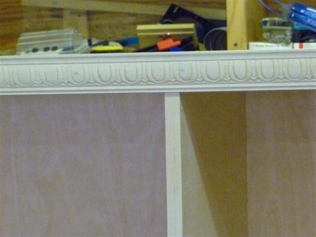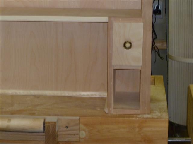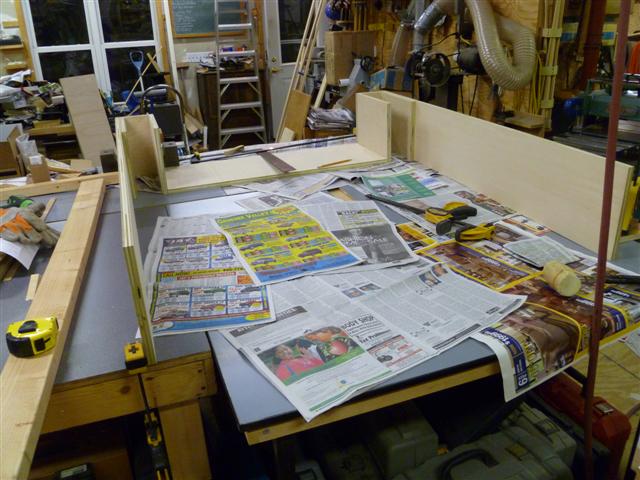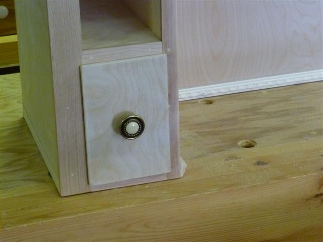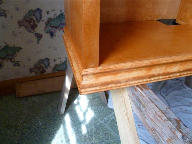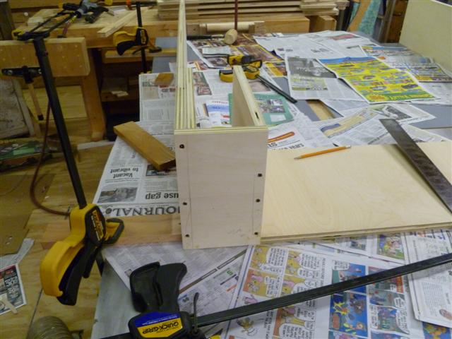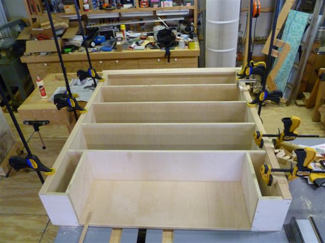 The bookcase is constructed of birch plywood. The bookcase is 48" wide, top 10" deep, bottom 16" deep, and 91" tall. The bottom of the case is 48" wide, 16" deep and 31" tall, with one shelf creating two openings. The top of the case is 10" deep, 48" wide, 60: tall, with four shelves having small drawers at the bottom of the top on either side. After the views of the bookcase, there are views of what happens when a person has too little to do to keep them productively occupied.