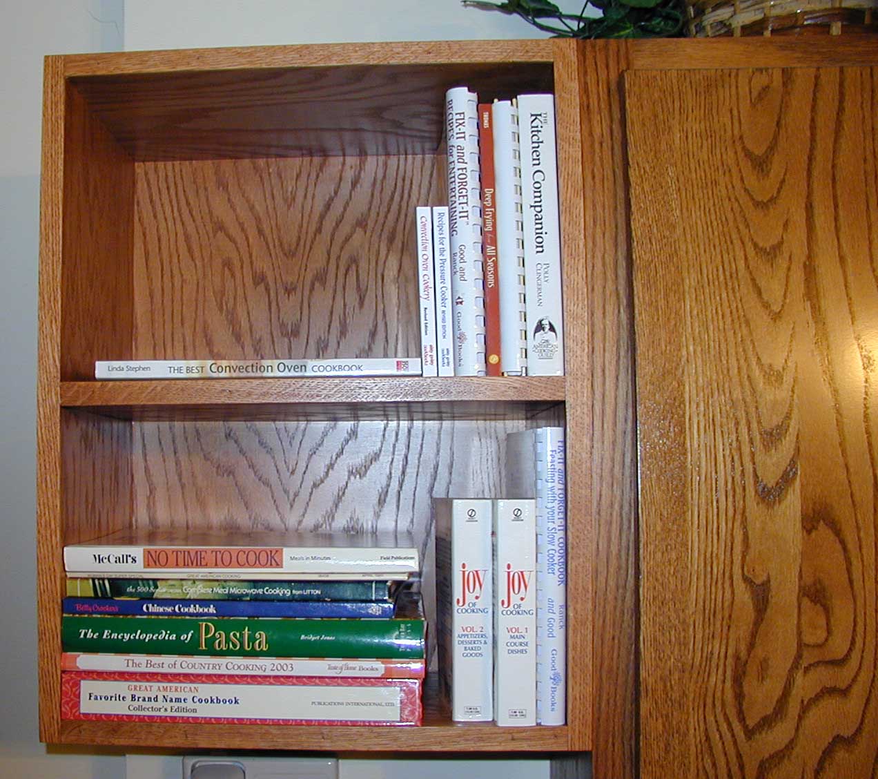 This cook book shelf is 18" wide by 22" tall by 12" deep. It is an extention of an exisiting kitchen cabinet.