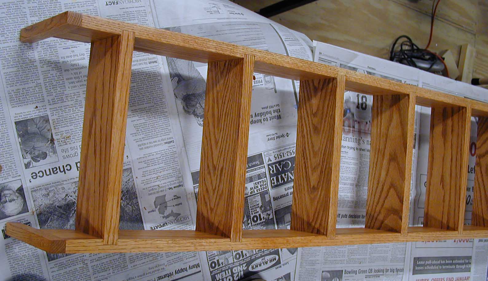 The camper ladder is 3/4" solid oak. The ladder leans against the top bunk and hooks into the bunk shelf.