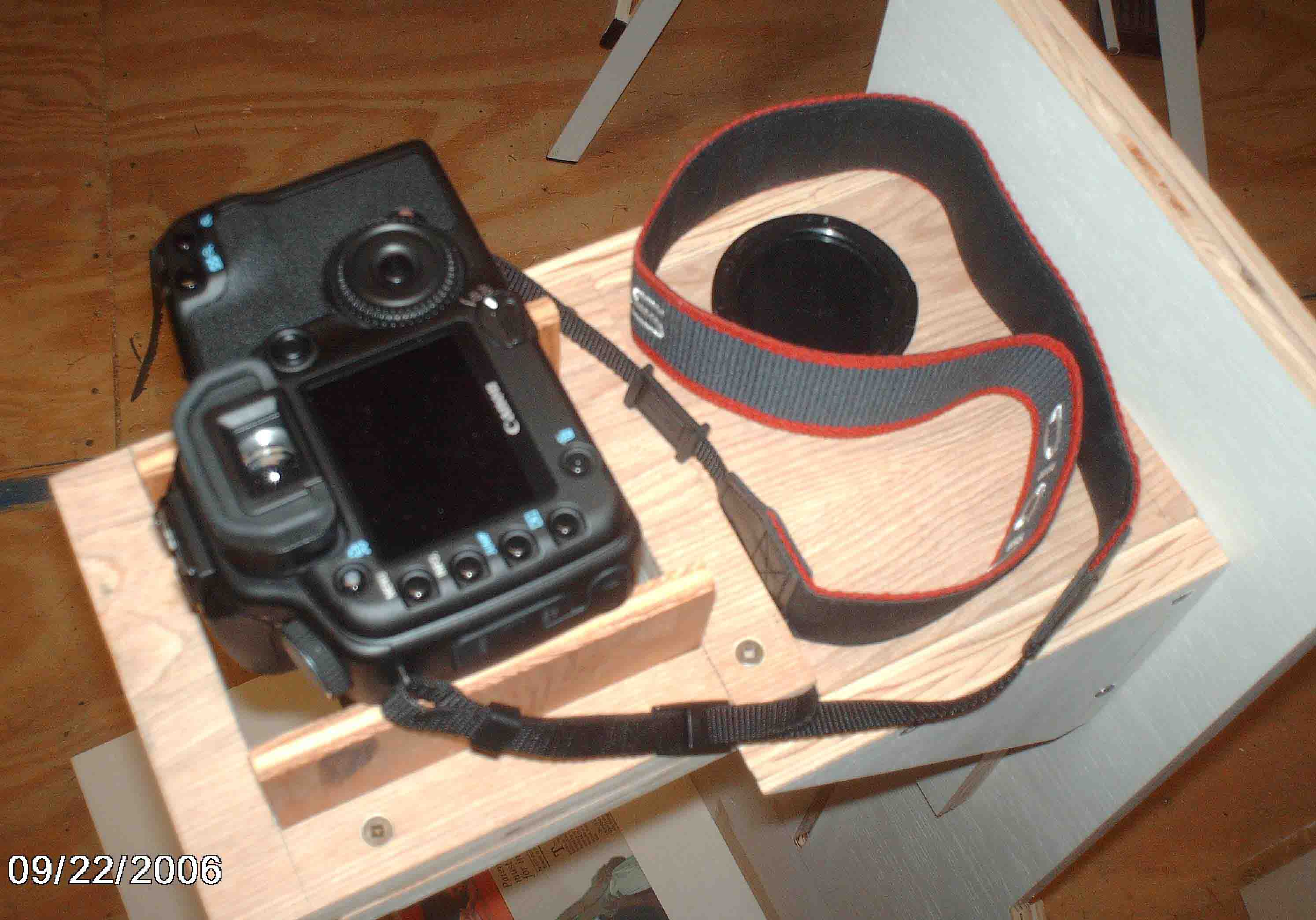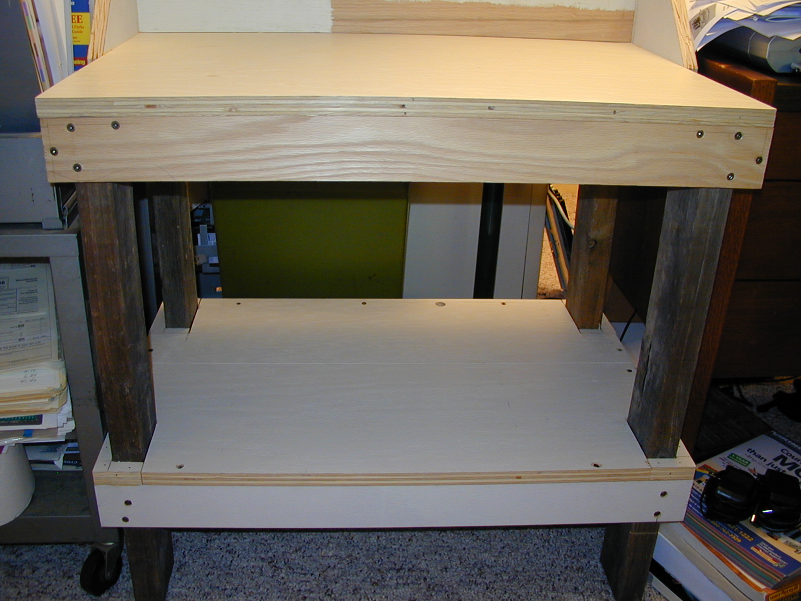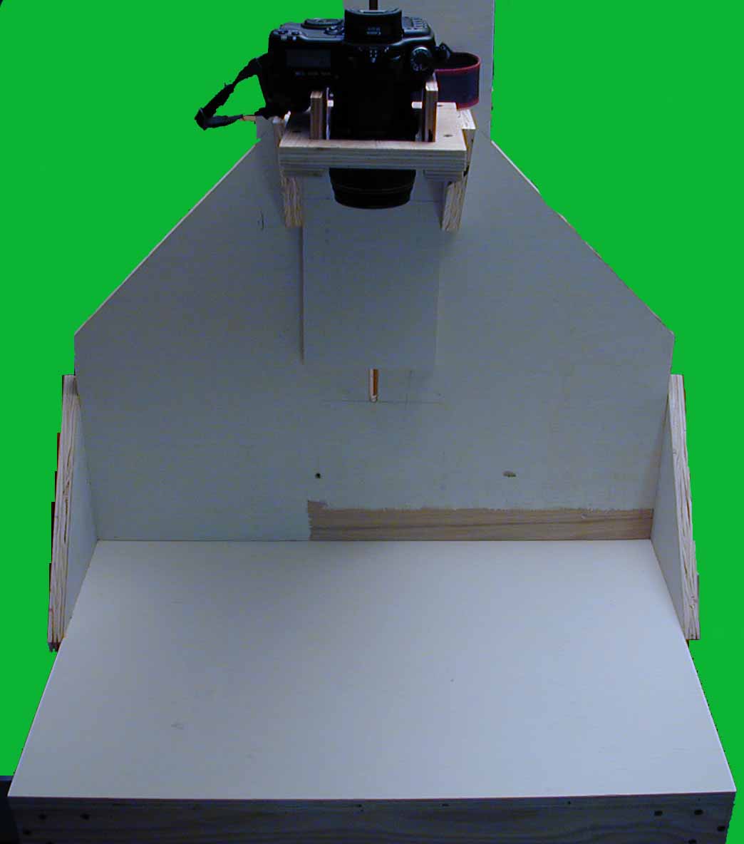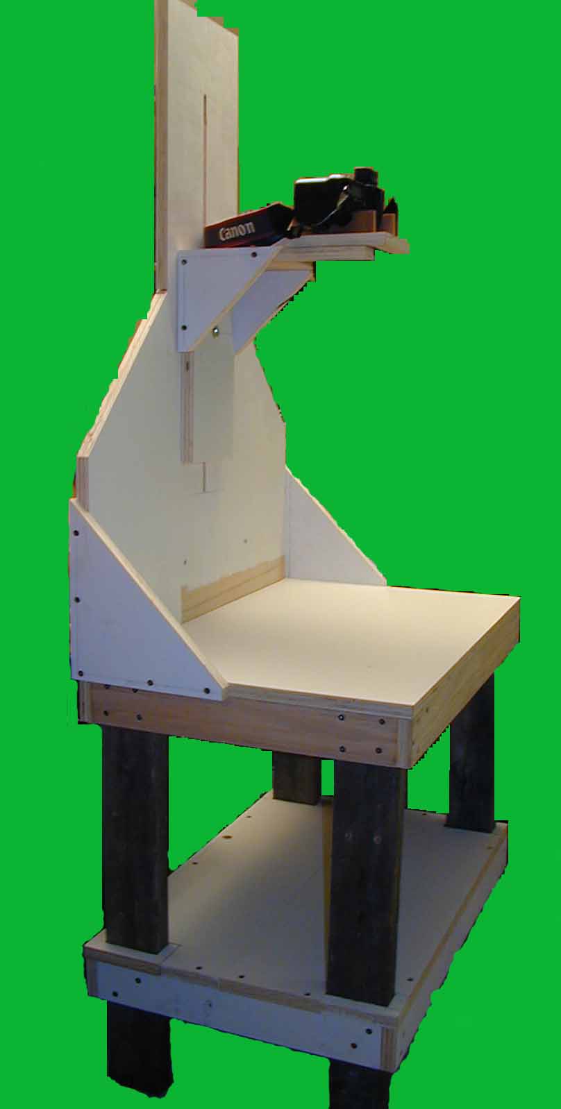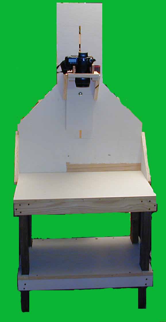 One of my interests is photography. One project is to take my old Pentax Spotmatic II slides and convert them to a digital format. Looking at slide copiers it became apparent that the costs were excessive for a single project. Looking at sending the slides to a commerical slide copy company resulted in the same decision: Costs were excessive. Considering other alternatives, Googling, resulted in the decision to acquire a copy stand. Commerical devices were again too costly for this project. Also from Googling a number of people showed that adquate copies could be made of slides with a digital camera and a copy stand. The resulting copy stand was created and is working quite well. Initally my intention was to place the copy stand on a table, but after thinking about it, my decision was to add legs and a shelf to the existing stand. Therefore there are some photographs of the copy stand without its legs and shelf and also photographs of the copy stand with its legs and shelf.