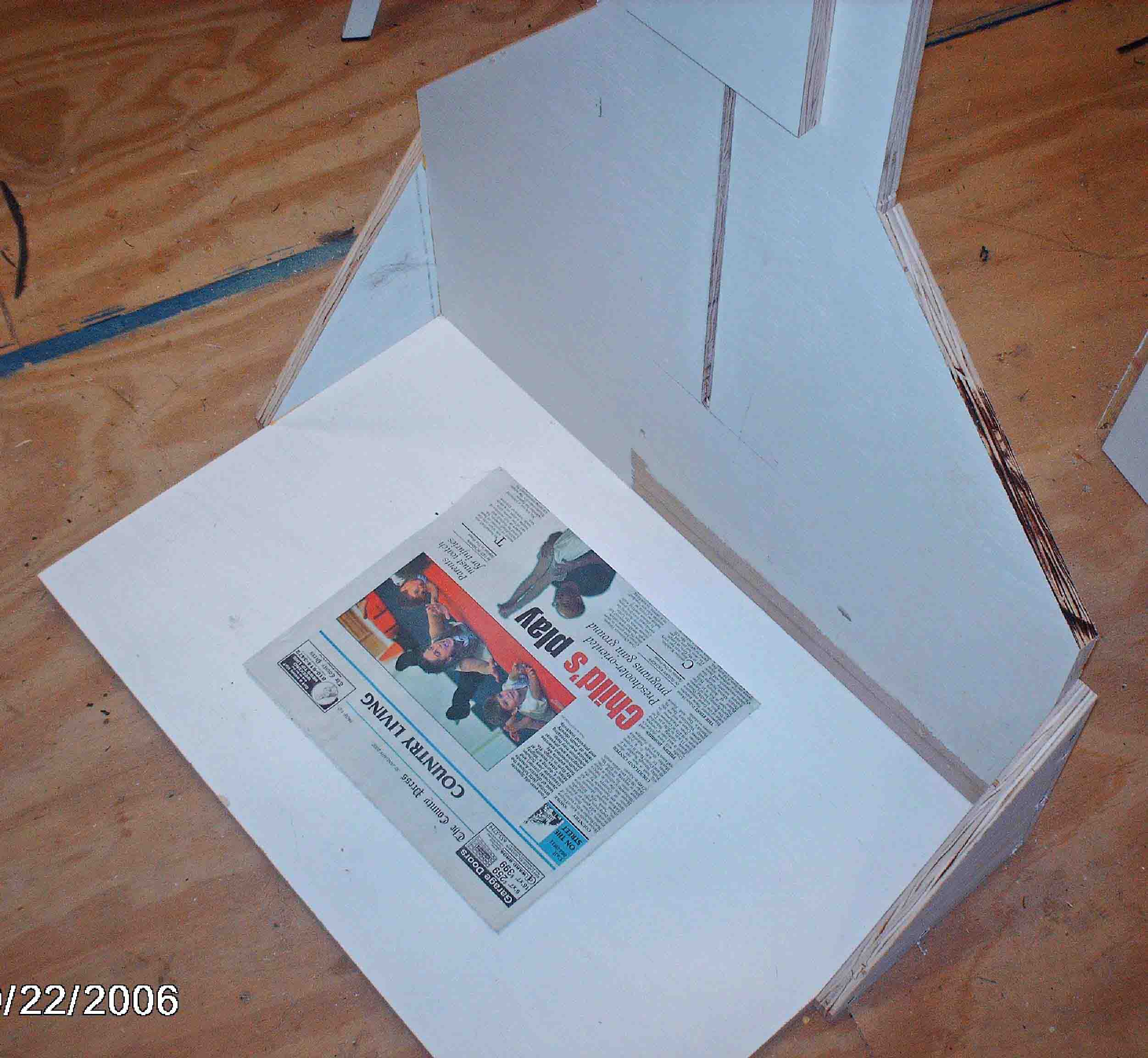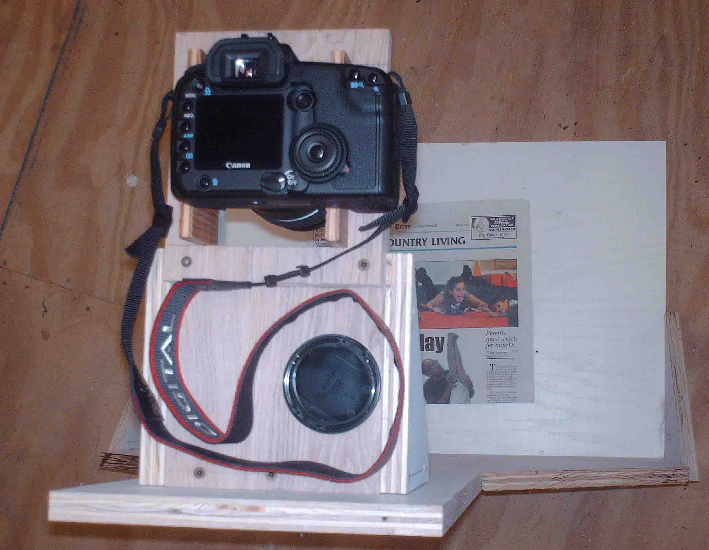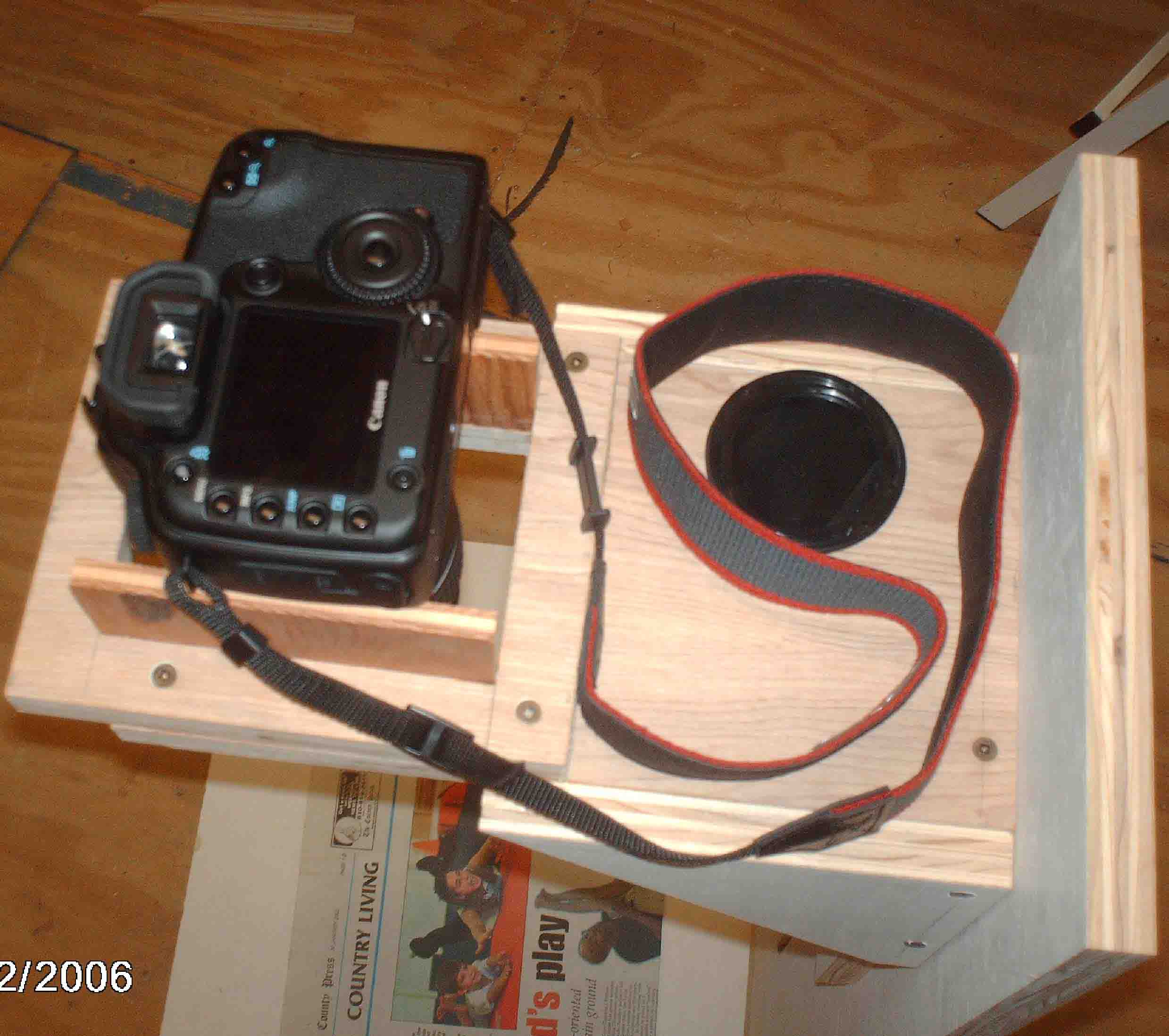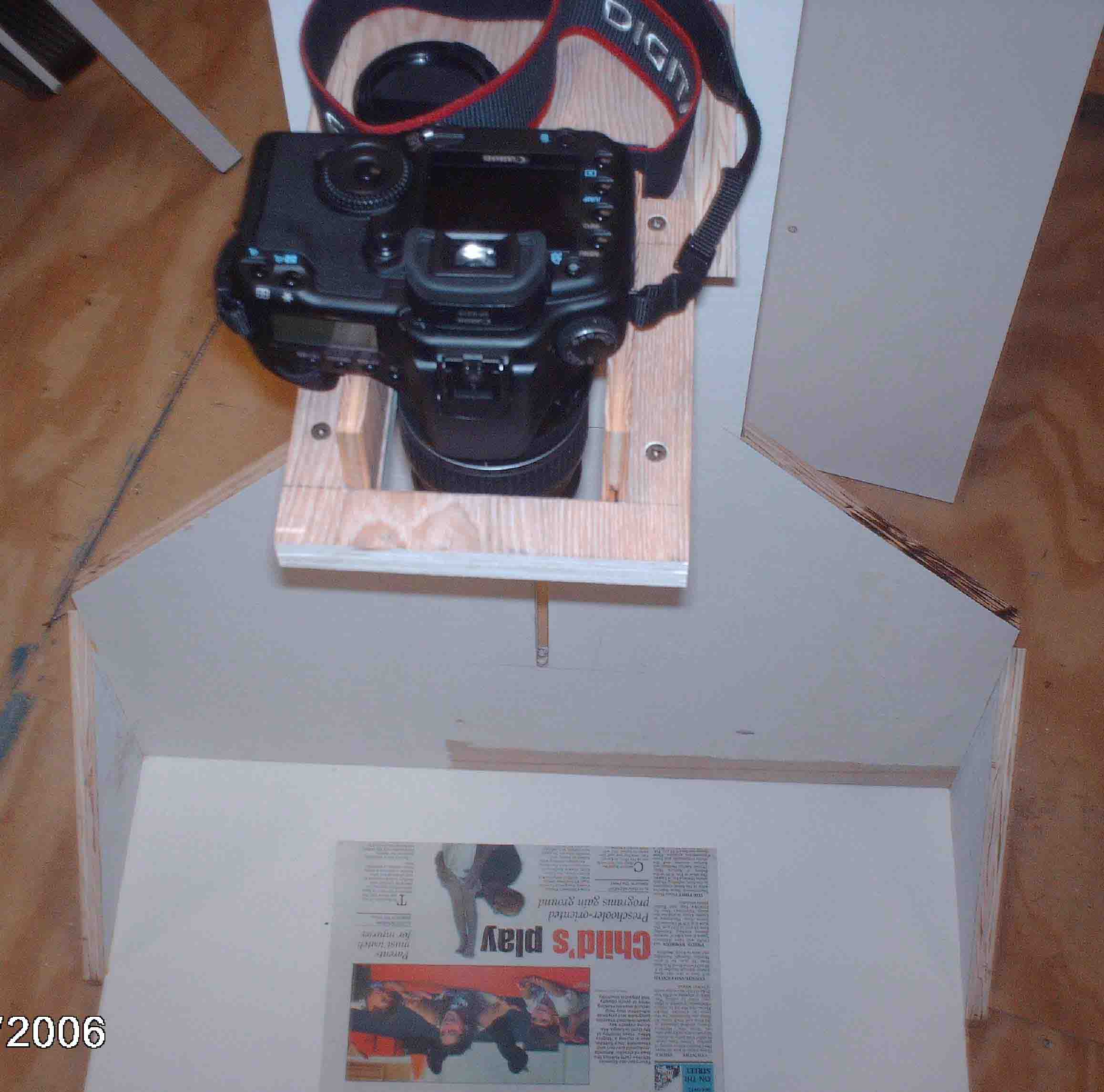 One of my interests is photography. One project is to take my old Pentax Spotmatic II slides and convert them to a digital format. Looking at slide copiers it became apparent that the costs were excessive for a single project. Looking at sending the slides to a commerical slide copy company resulted in the same decision: Costs were excessive. Considering other alternatives, Googling, resulted in the decision to acquire a copy stand. Commerical devices were again too costly for this project. Also from Googling a number of people showed that adquate copies could be made of slides with a digital camera and a copy stand. The resulting copy stand was created and is working quite well. Initally my intention was to place the copy stand on a table, but after thinking about it, my decision was to add legs and a shelf to the existing stand. Therefore there are some photographs of the copy stand without its legs and shelf and also photographs of the copy stand with its legs and shelf.