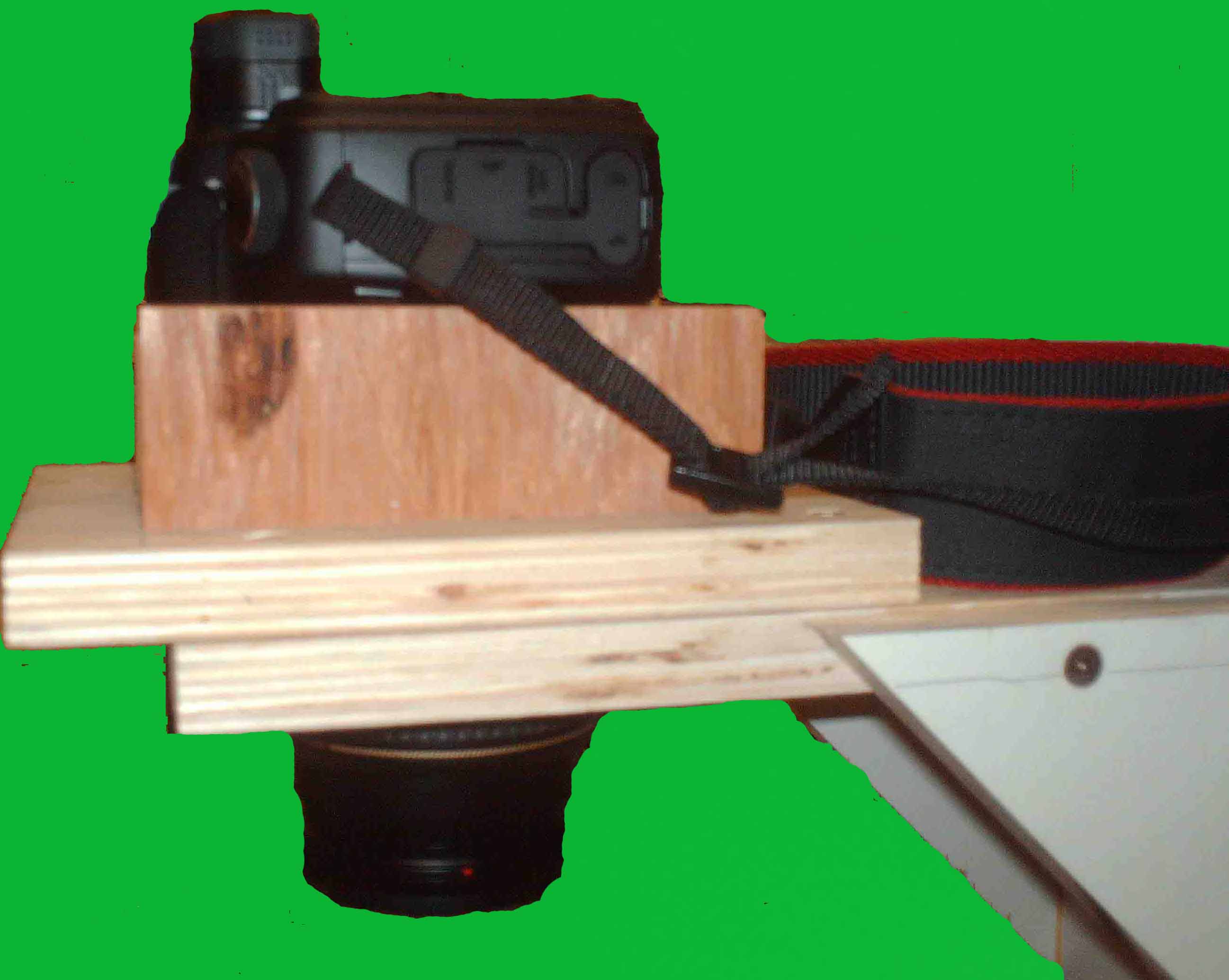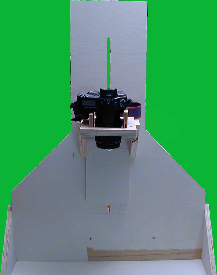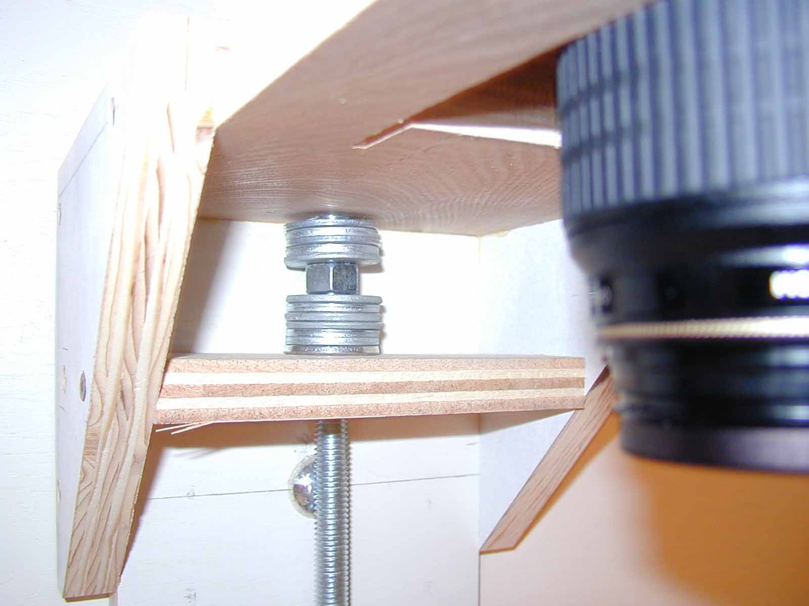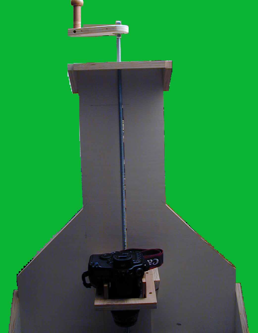 After using the copy stand it became apparent that there needed to be a finer adjustment for the camera holder. So the stand was modified with a 1/2 inch threaded rod and crank. The rod goes from the top through a 1/2 nut and washers under the camera slide down through the top of the stand into a pocket with two 1/2 nuts locked together. This required another bolt and nut lower than the originial nut and bolt holding the camera slide to the back of the camera stand to prevent the camera slide from rotating with the slide was moved up or down above the stand table surface. When the crank is turned the nut and washers under the camera slide move the slide up or down. The nut in the camera slide is held in place by a wrench mounted to a wood block. The locked nuts under the copy stand top prevent the bottom of the rod from moving up or down. This allows very good control of the up and down position of the camera. Moving the light box back and forth takes care of the lateral movement required for positioning the slide or negative to be copied. B&W negatives are converted to positives via software for viewing and placing the image on a DVD or as part of a slide show.