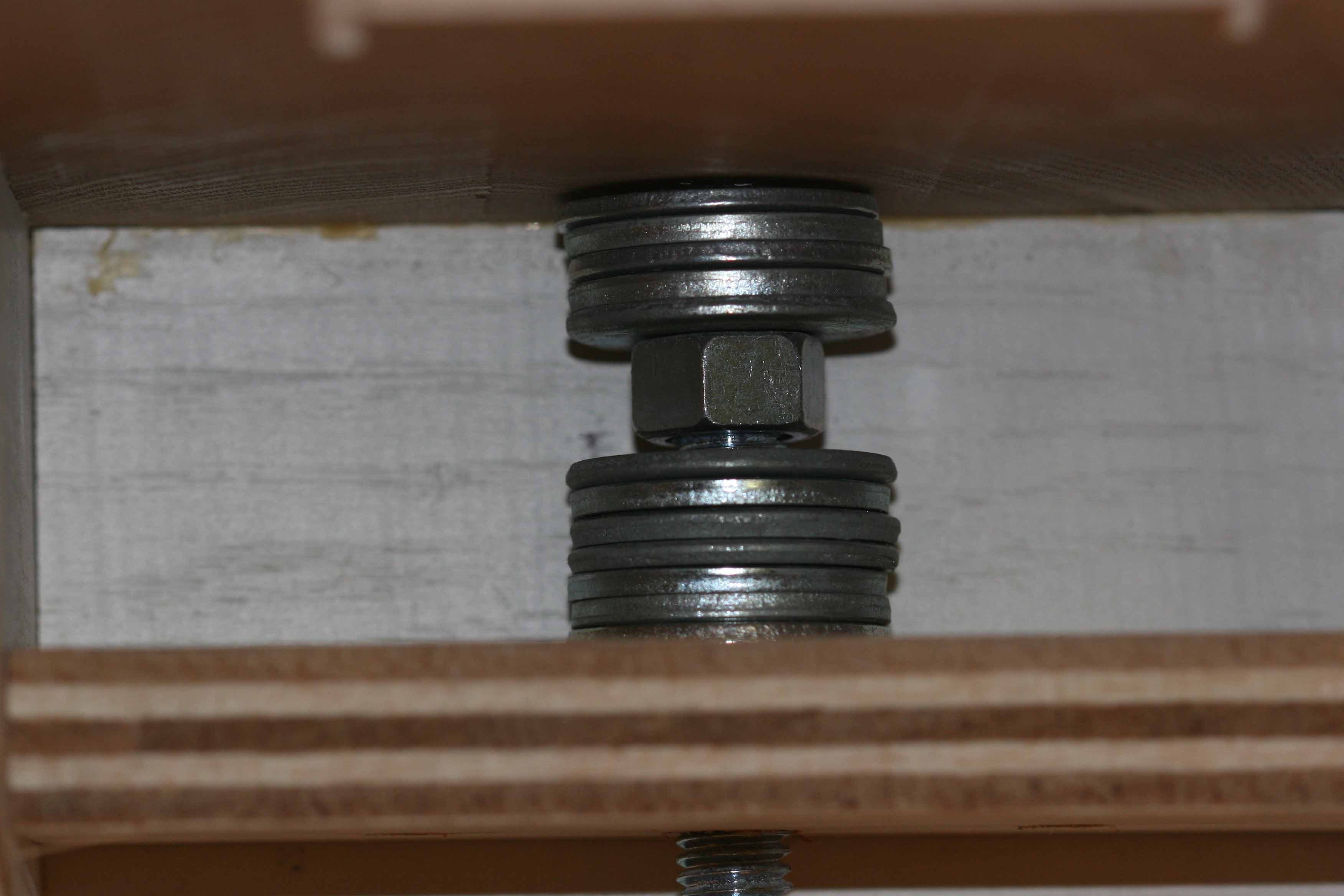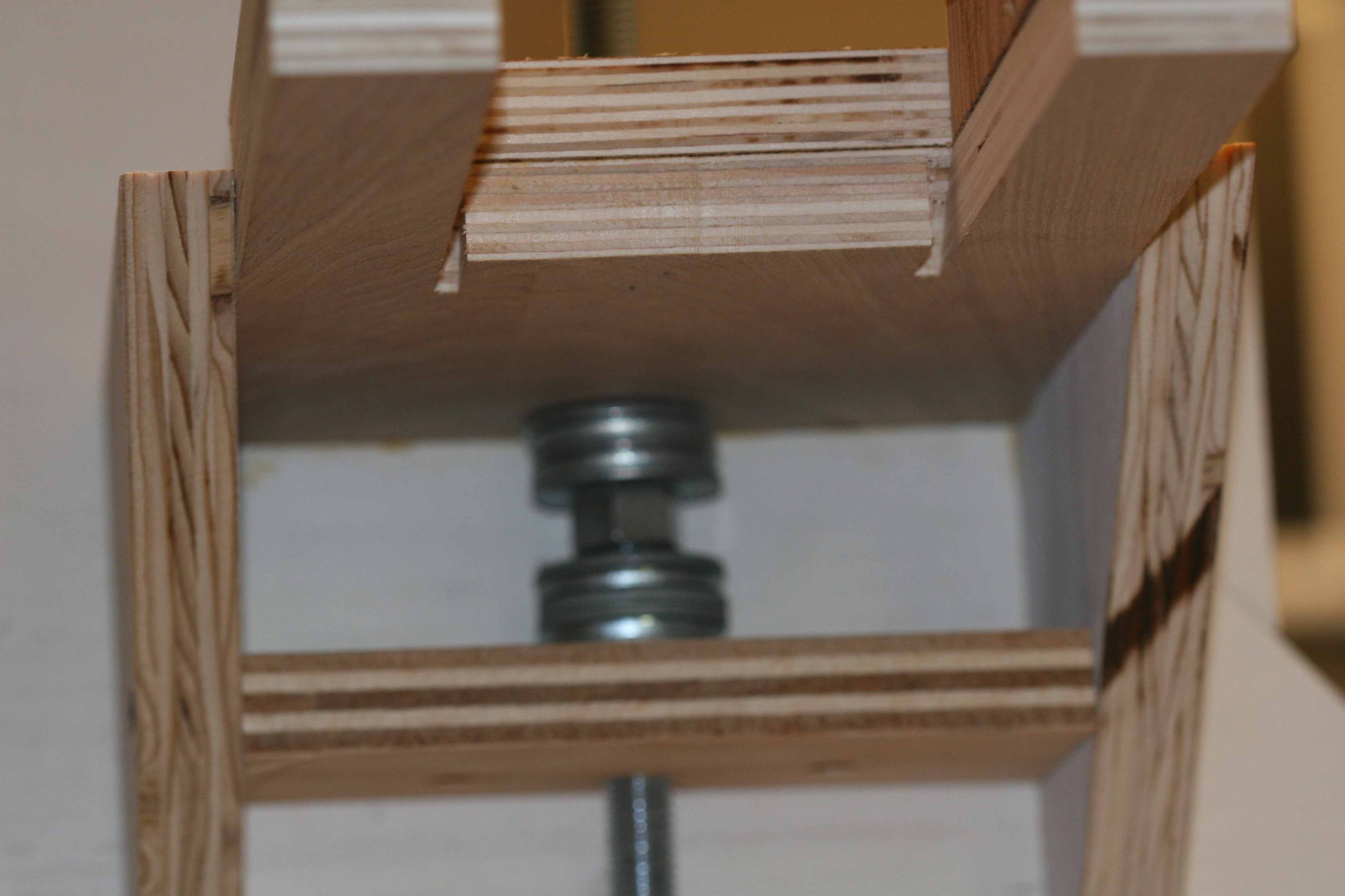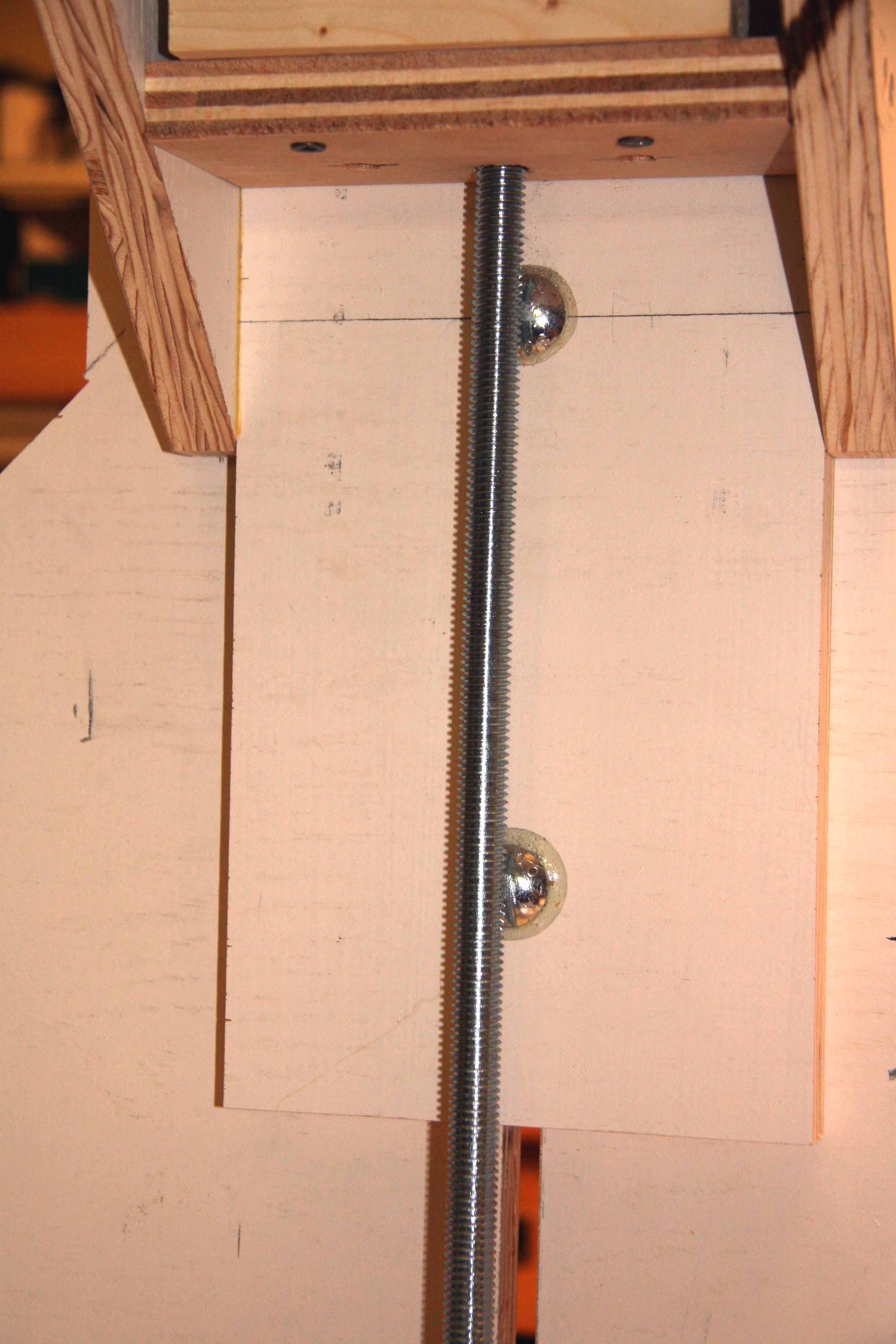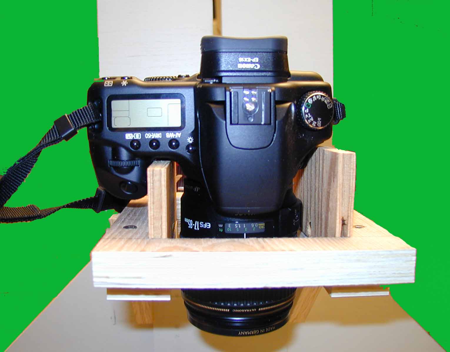 After using the copy stand it became apparent that there needed to be a finer adjustment for the camera holder. So the stand was modified with a 1/2 inch threaded rod and crank. The rod goes from the top through a 1/2 nut and washers under the camera slide down through the top of the stand into a pocket with two 1/2 nuts locked together. This required another bolt and nut lower than the originial nut and bolt holding the camera slide to the back of the camera stand to prevent the camera slide from rotating with the slide was moved up or down above the stand table surface. When the crank is turned the nut and washers under the camera slide move the slide up or down. The nut in the camera slide is held in place by a wrench mounted to a wood block. The locked nuts under the copy stand top prevent the bottom of the rod from moving up or down. This allows very good control of the up and down position of the camera. Moving the light box back and forth takes care of the lateral movement required for positioning the slide or negative to be copied. B&W negatives are converted to positives via software for viewing and placing the image on a DVD or as part of a slide show.