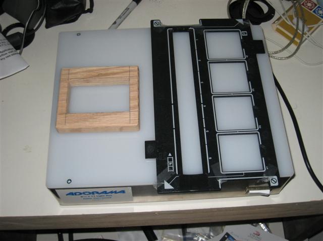 View Thirty shows the wood block that holds large negatives flat on the light box along with the plastic holder for strips of negatives and regular 35mm slides mounted in a cardboard holder.