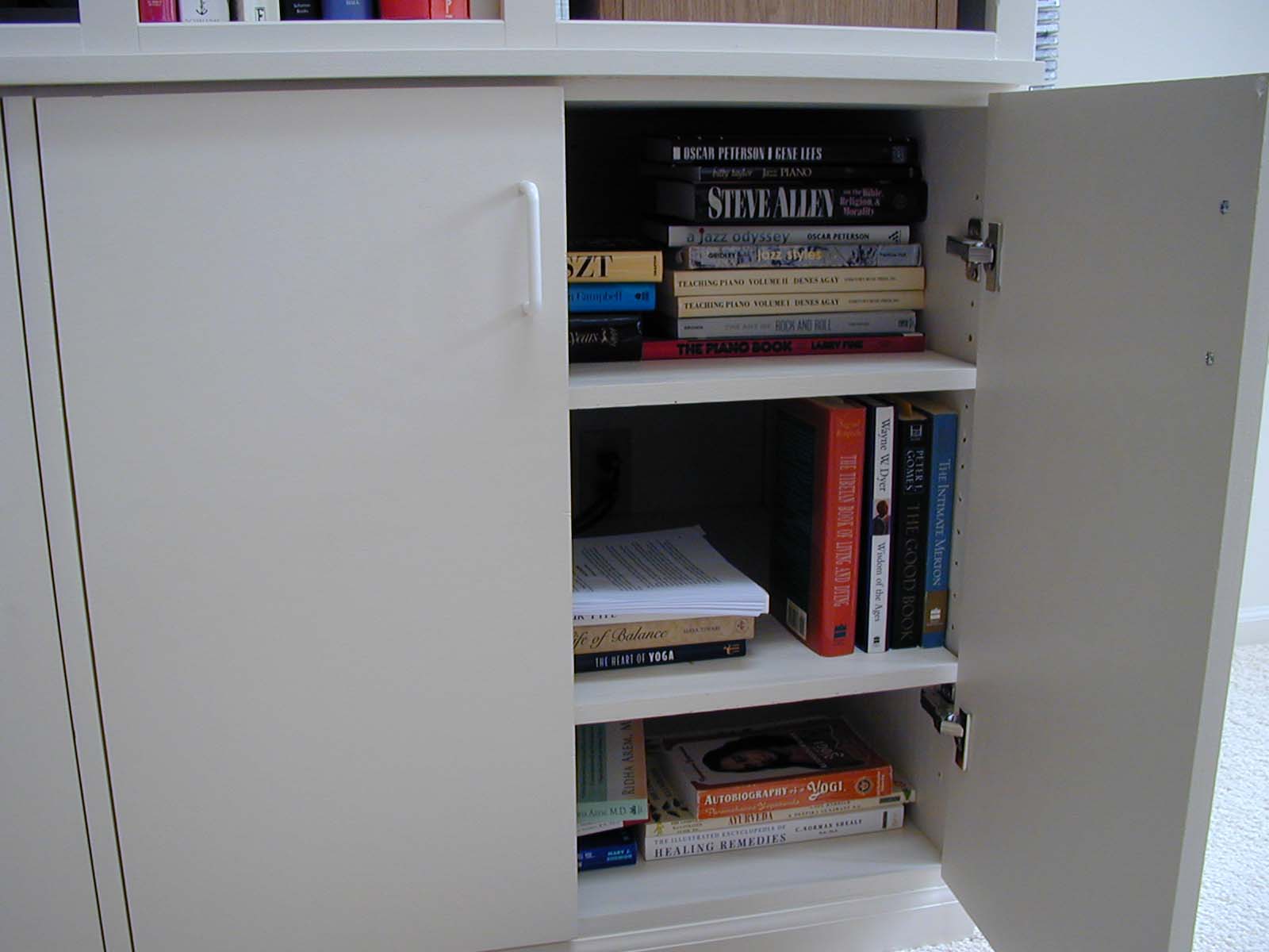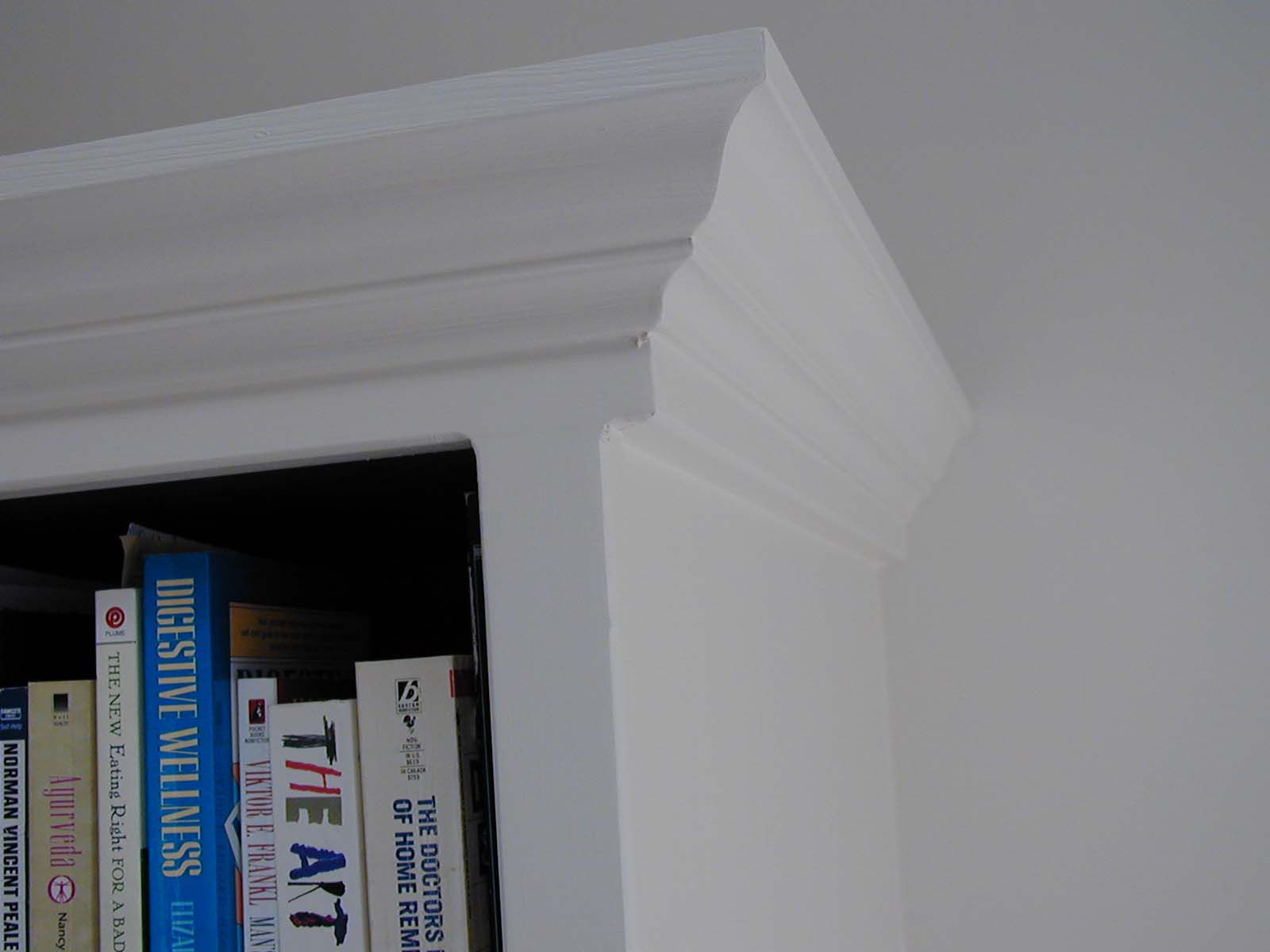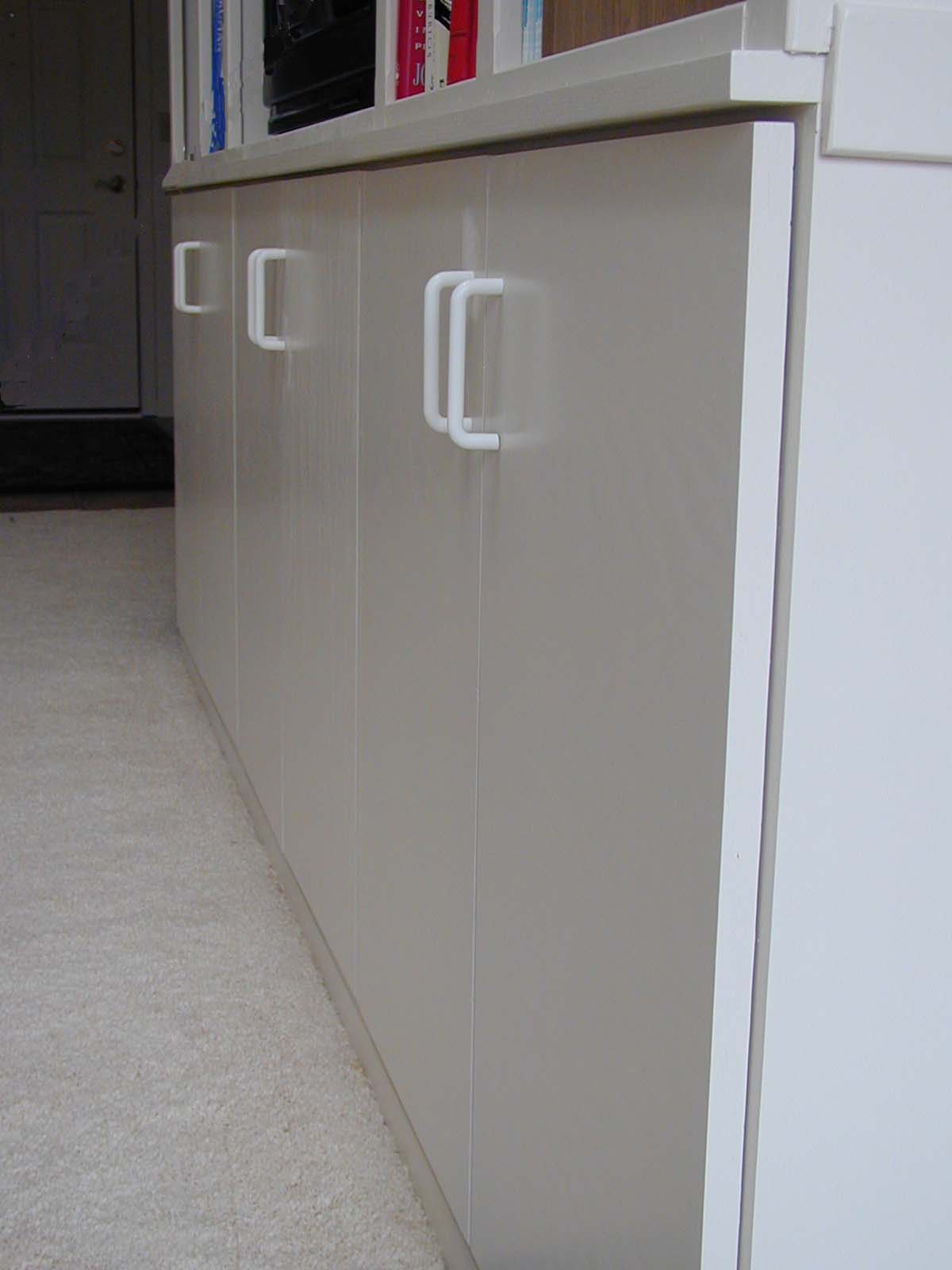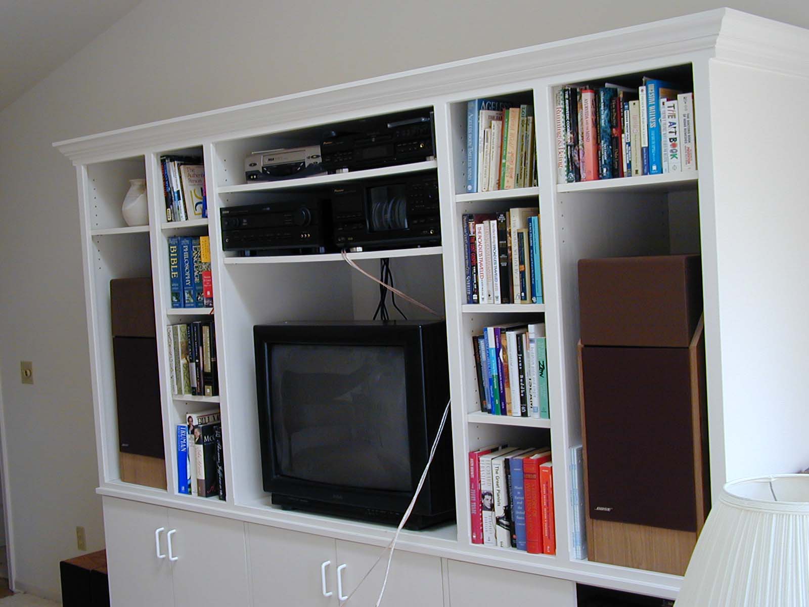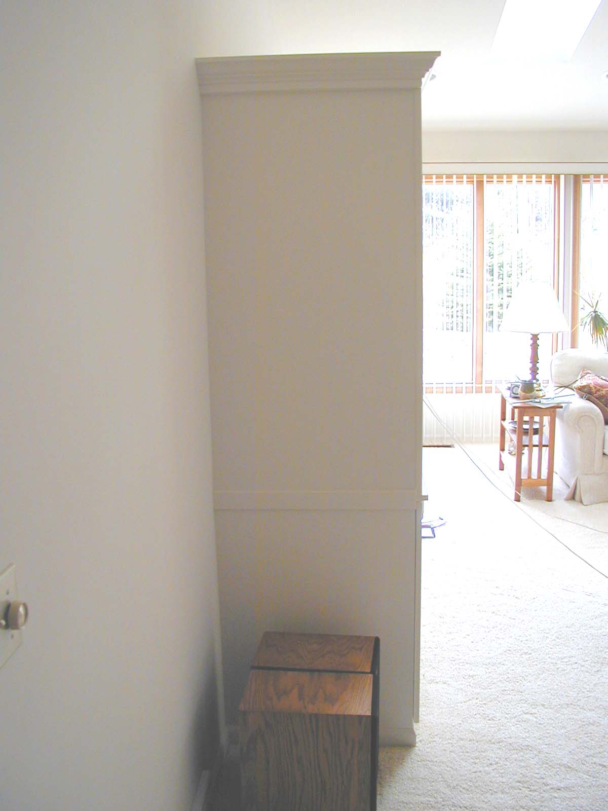 The Entertainment Center is eight feet wide, seven feet tall, and two feet deep. It has three double doors in the base for the bottom storage. The top has a crown molding which matches the kitchen crown molding. The main living area is a large room with the kitchen on one side with the living area in the center of the house. The receiver drives two Bose and two JBL speakers for surround sound. The side view is quite dark because of the lighting in the room. Some other photos lack detail because the Entertainment Center is bright white, the room is white, the carpet is white, and the Sun was very bright. We were starting to install the surround sound speakers. The wires you see in some of the photos were used to test speaker placement in the room. The wires were later placed inside the walls and under the floor to the back speakers.