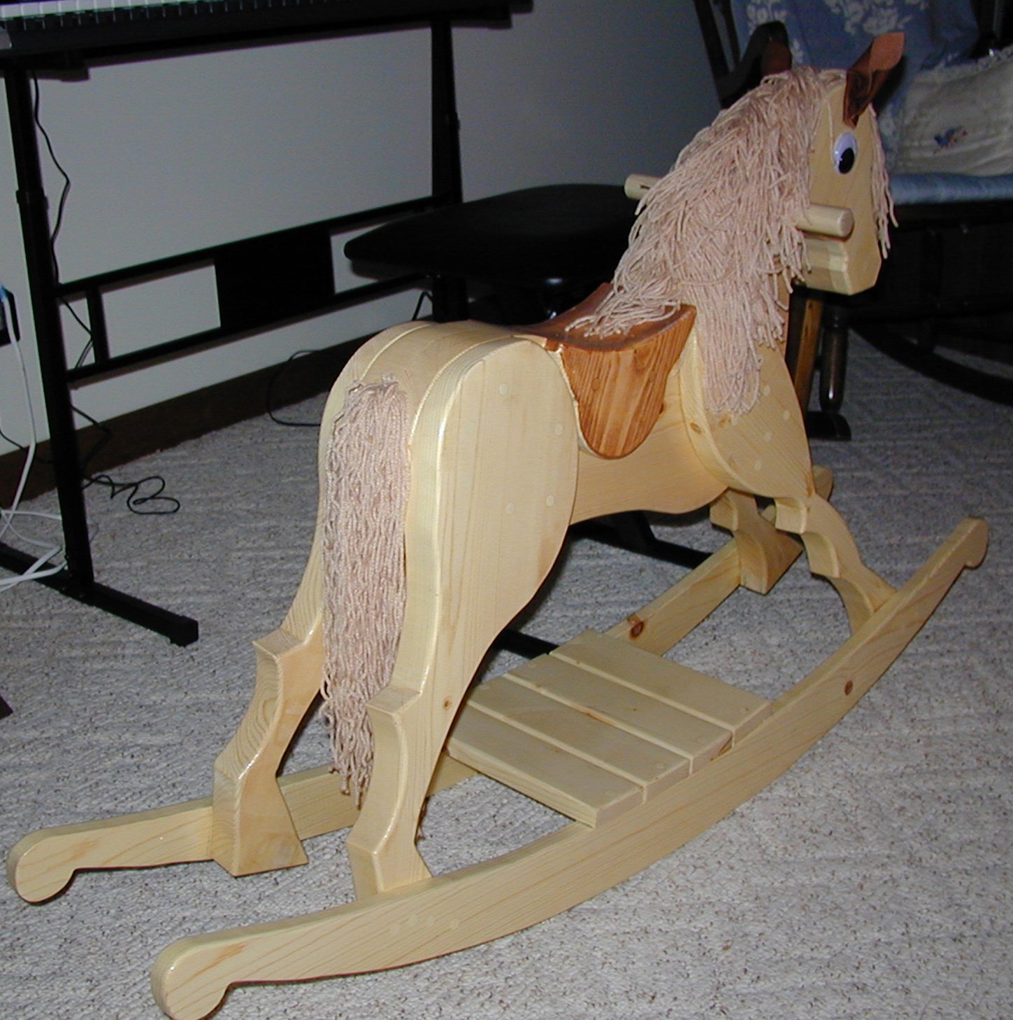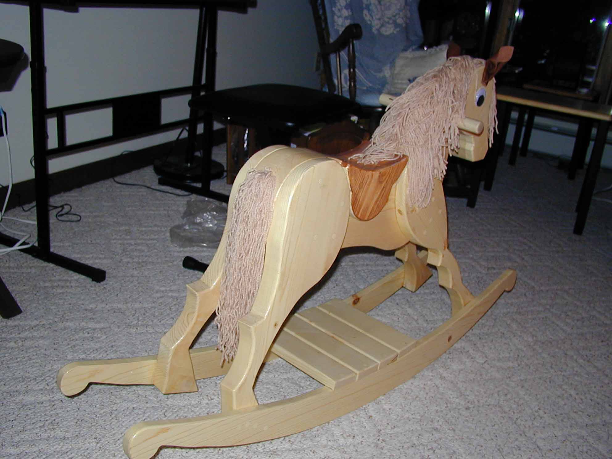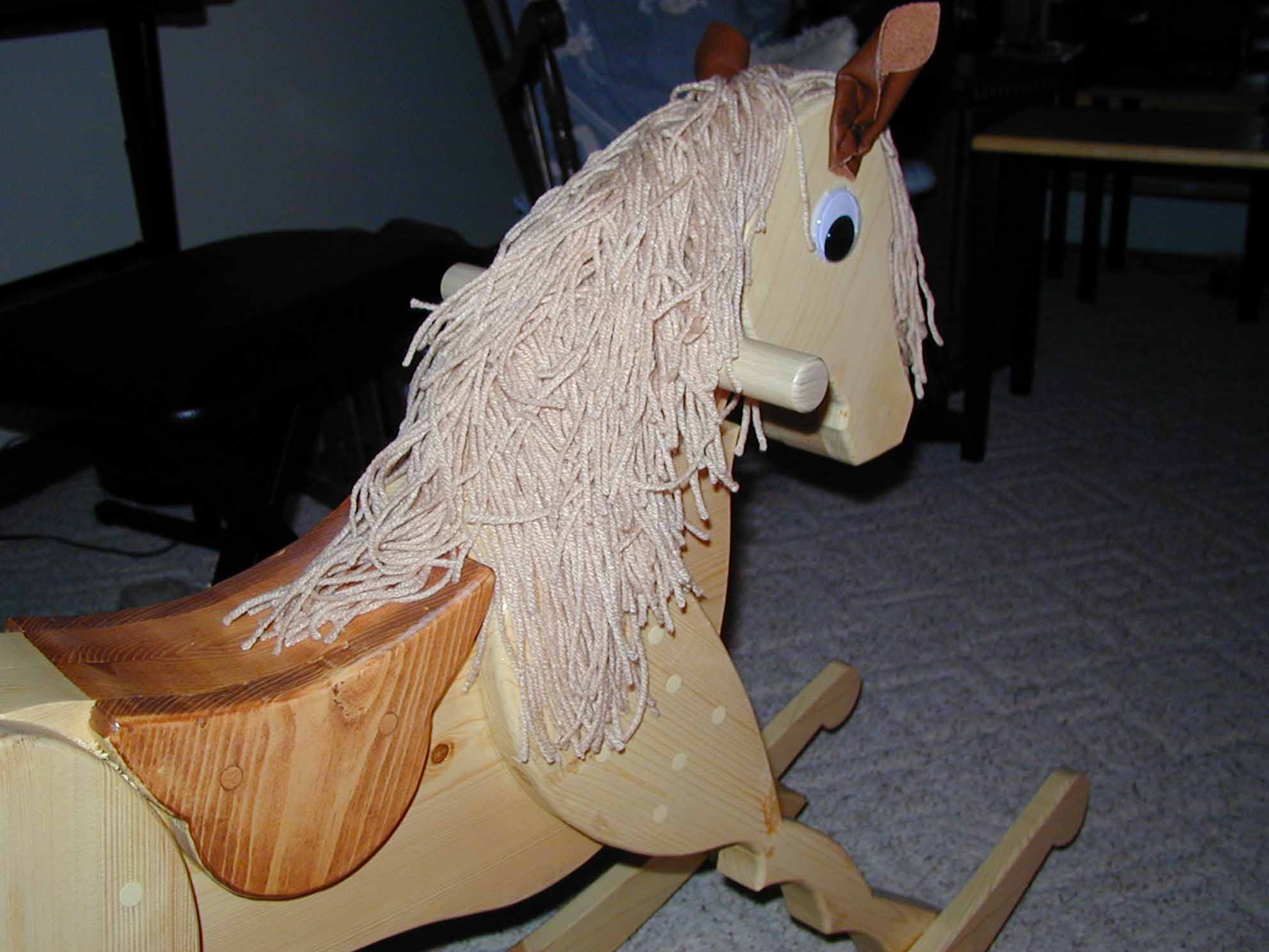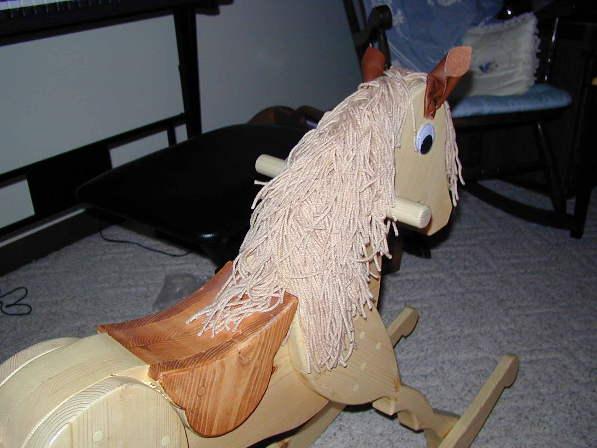 The Rocking Horse is made of pine. The saddle was stained. The mane is yarn. The eyes were found in a craft store. The ears are made from leather.