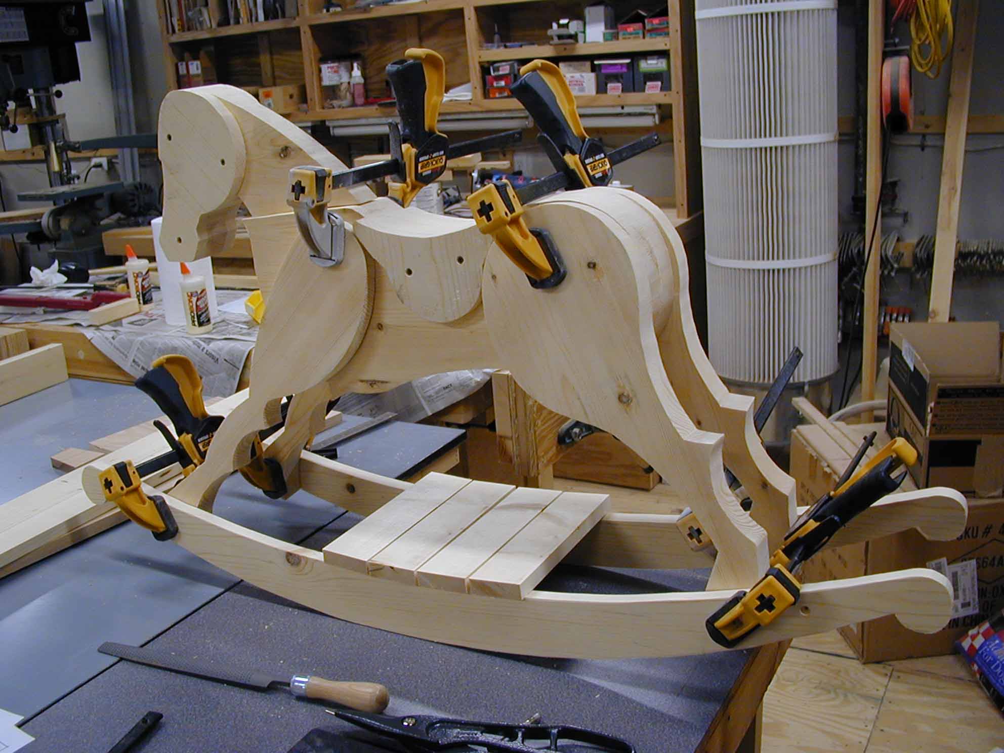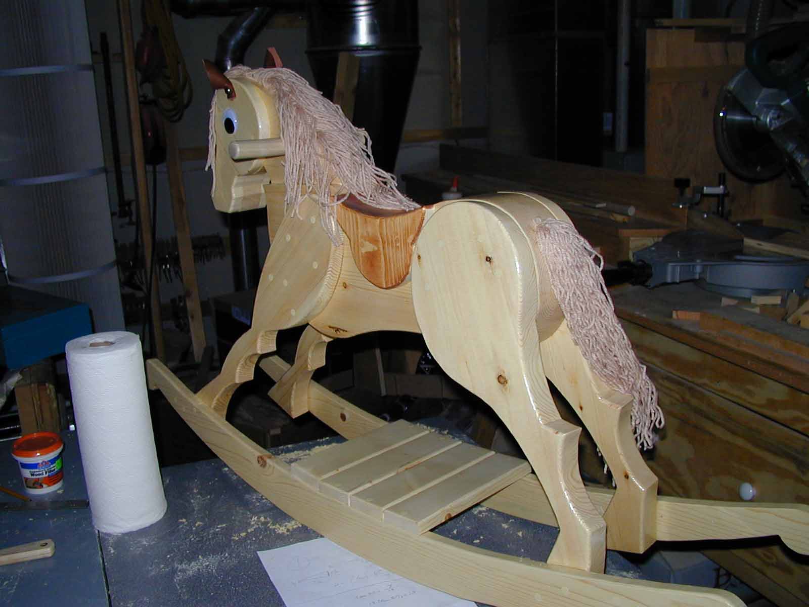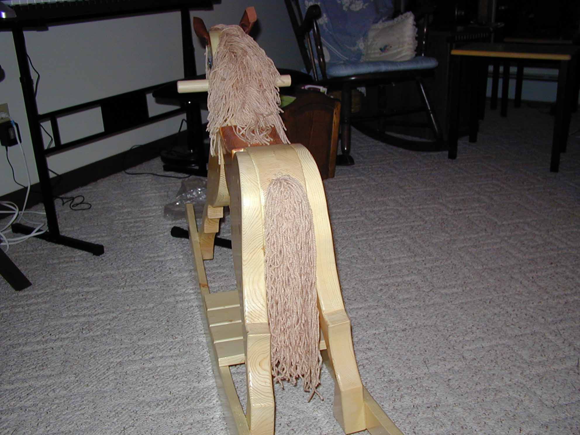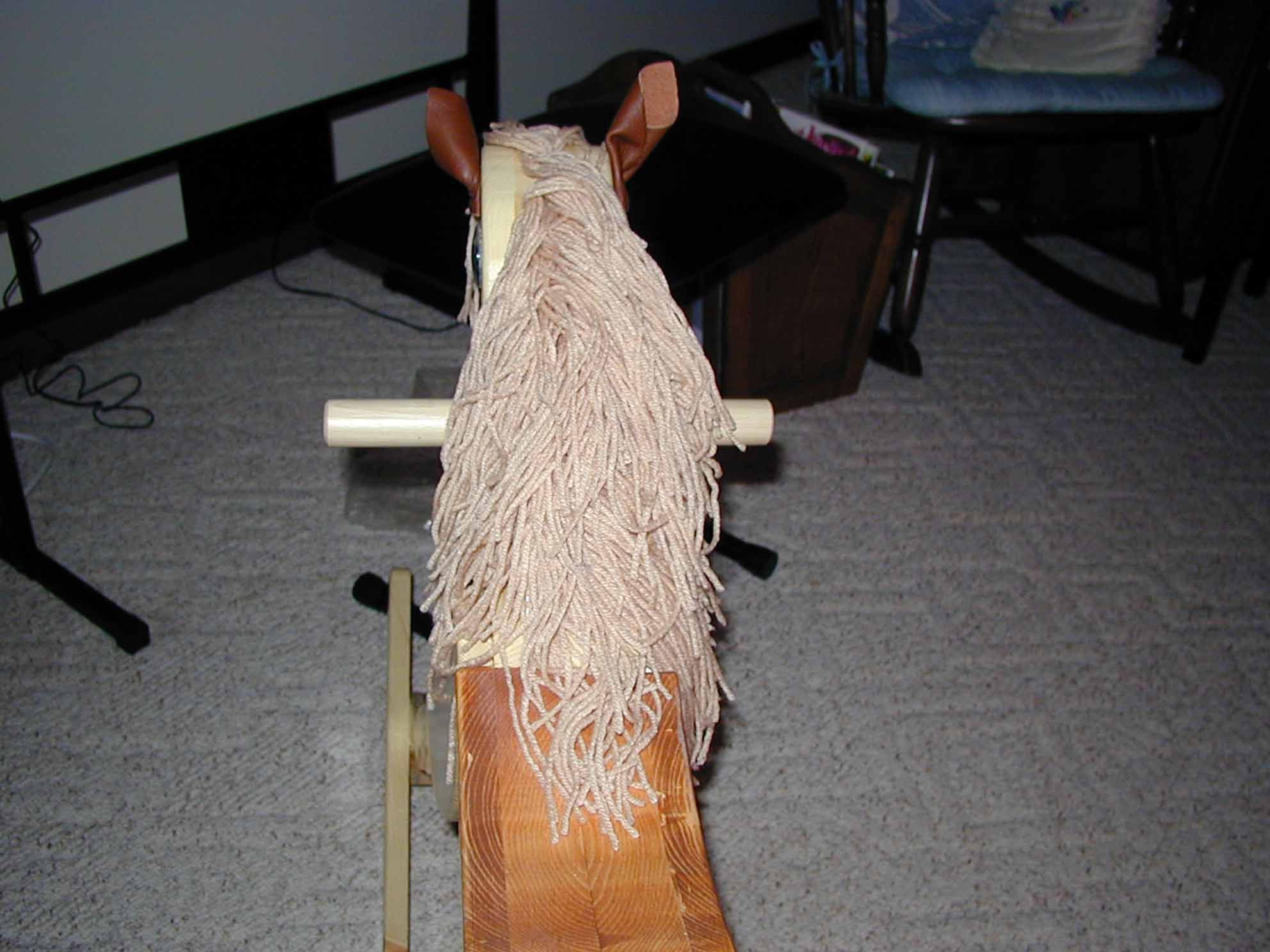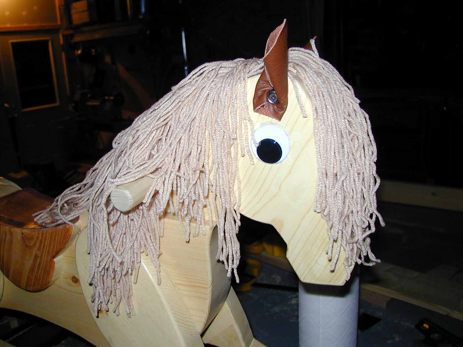 The Rocking Horse is made of pine. The saddle was stained. The mane is yarn. The eyes were found in a craft store. The ears are made from leather.