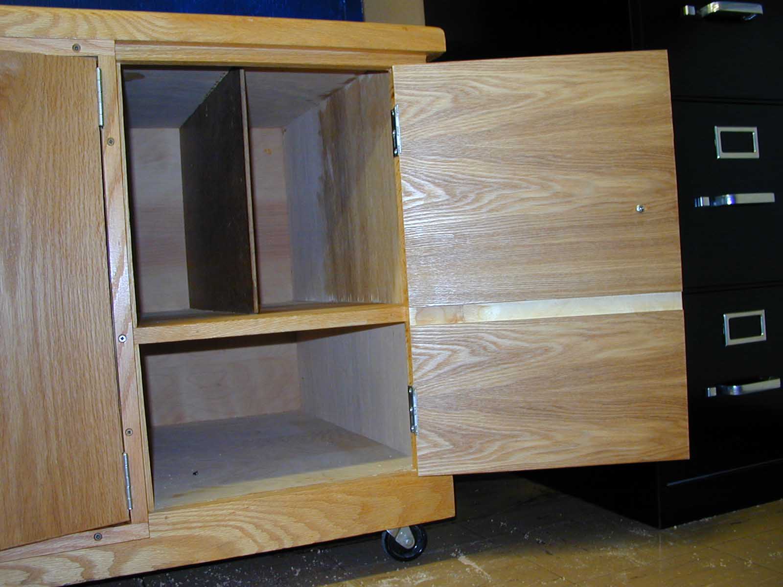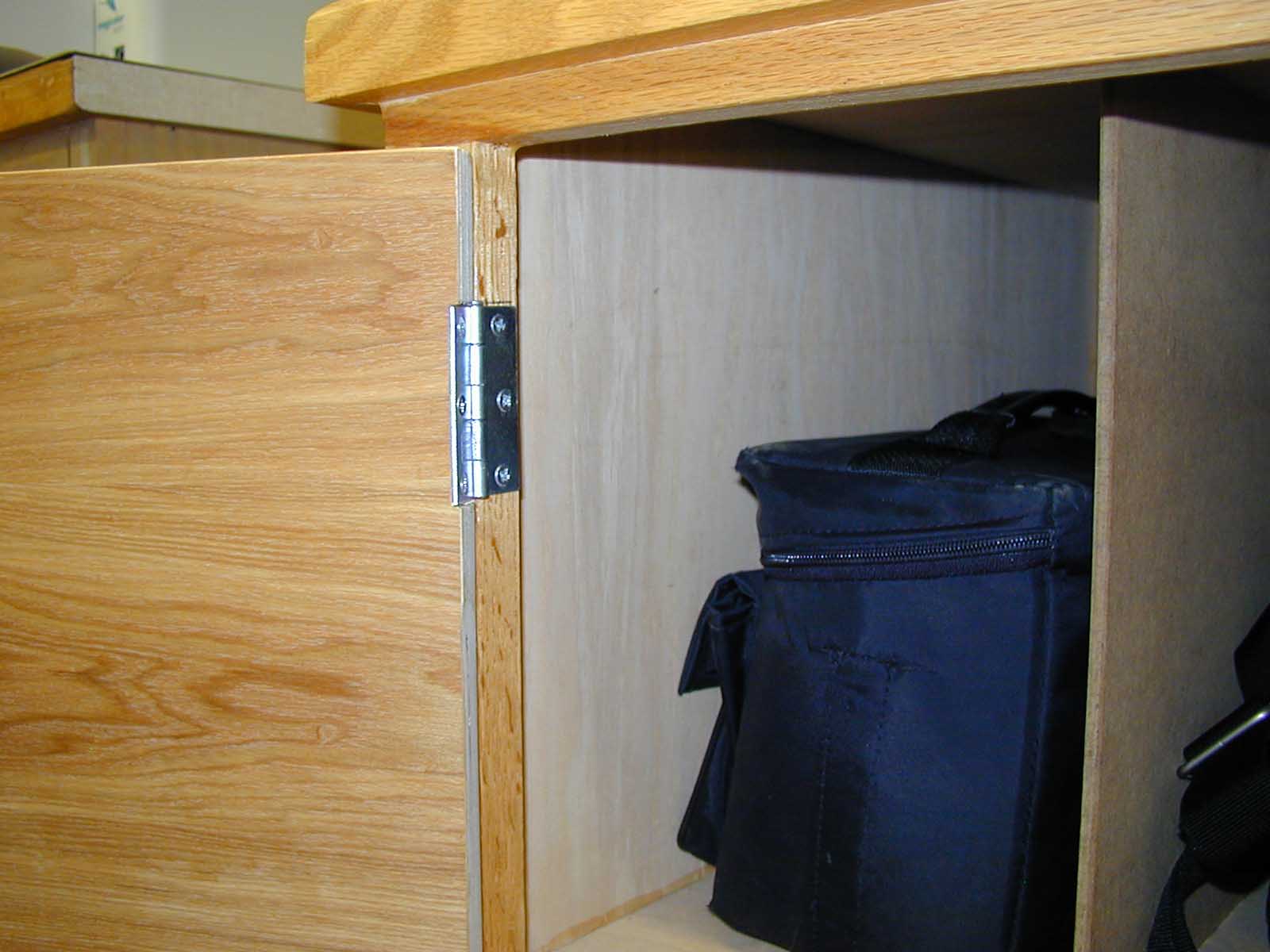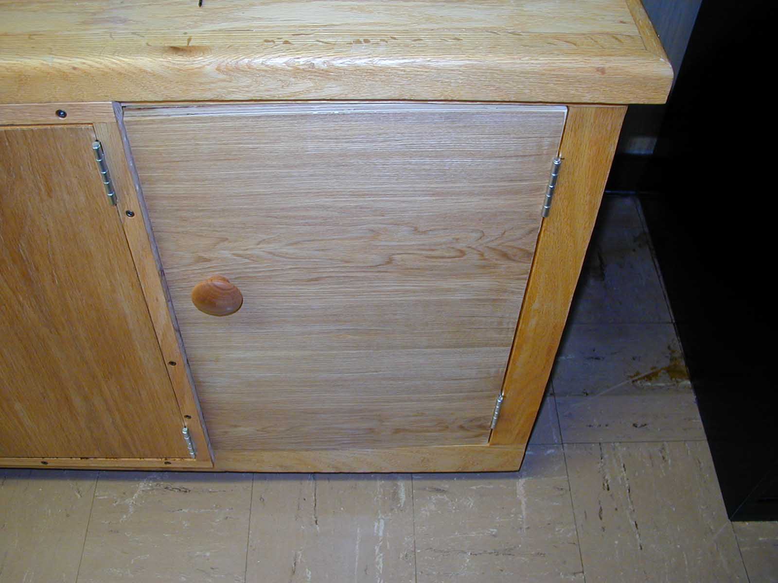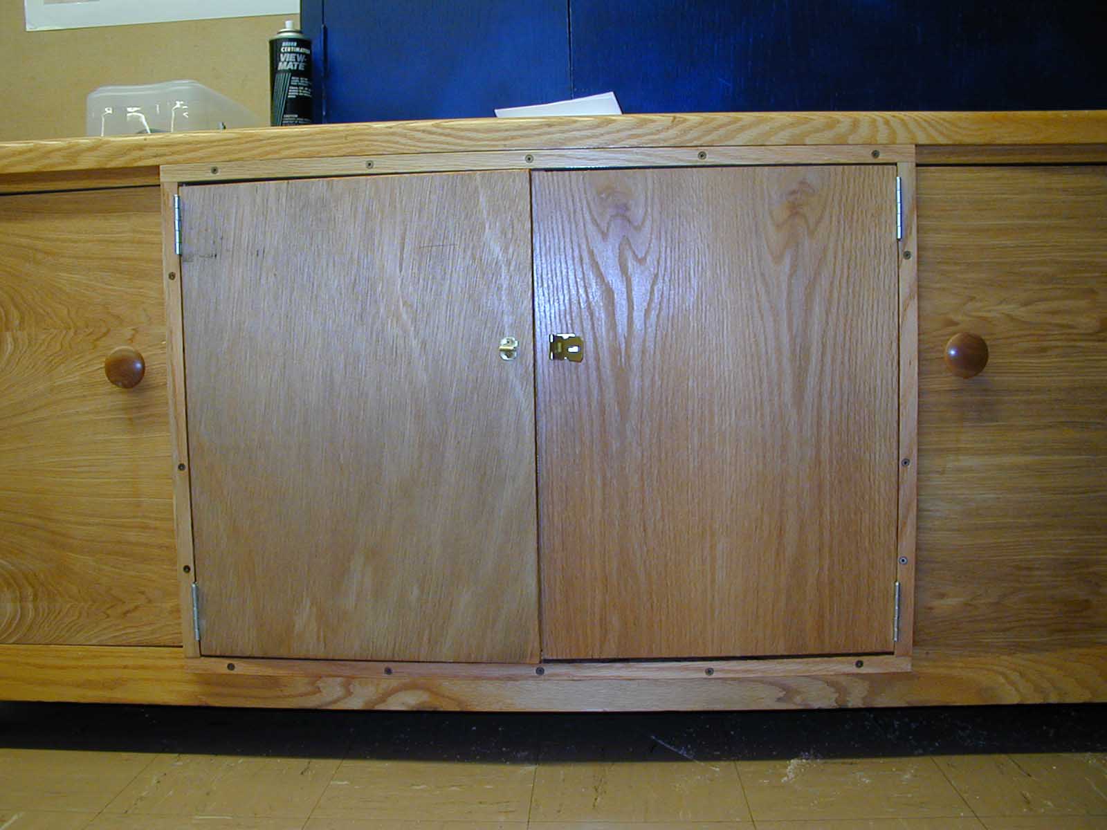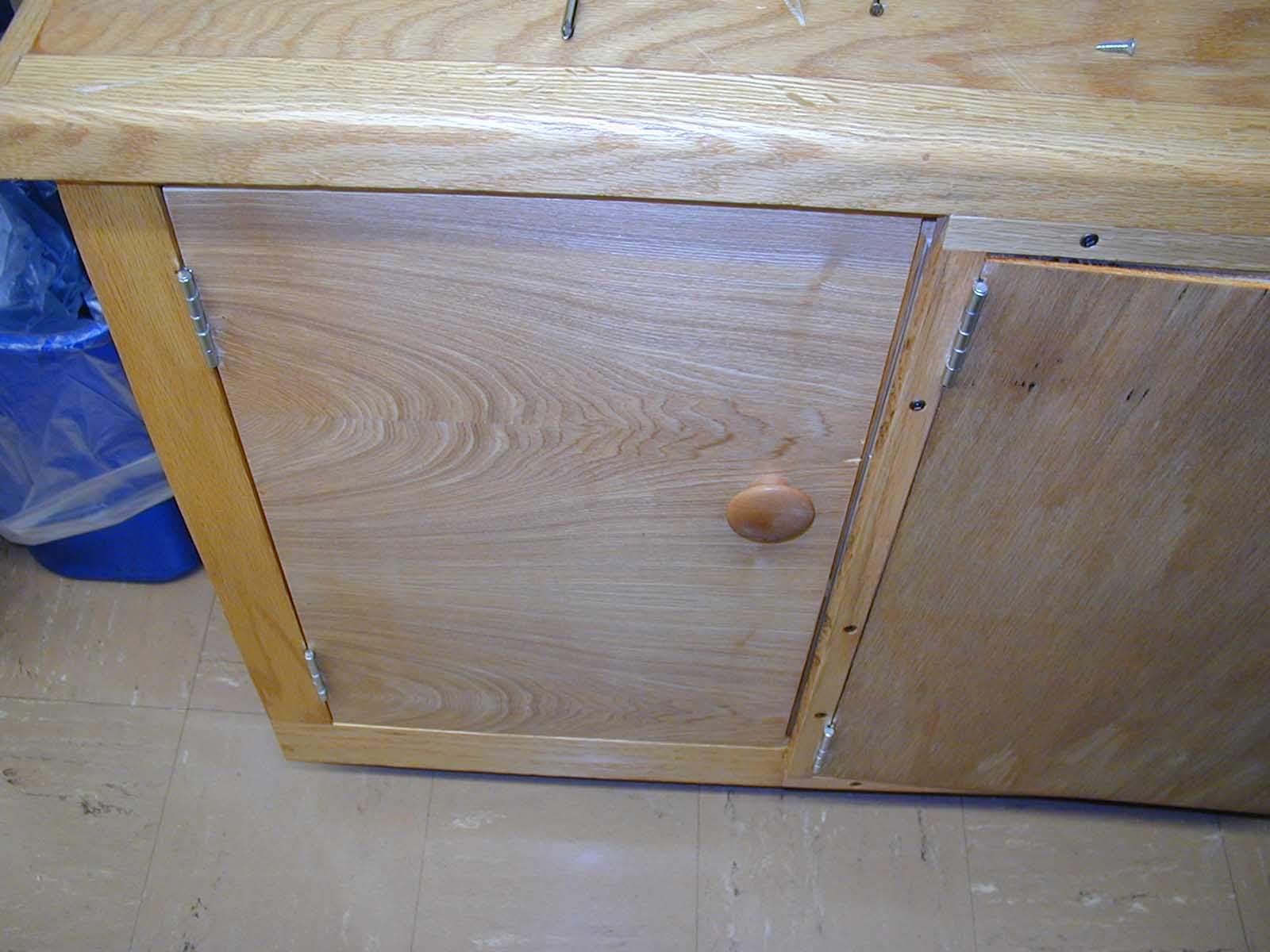 The cabinet was originally built without doors. Two center doors were added after the cabinet was finished; they had hinges that would allow the doors to open at a 90 degree angle to the cabinet. Later the doors were to be modified so that they would open flush to the face of the cabinet. A face frame was created using ¼" oak; butt hinges were attached in place of the original hinges to the doors and the face frame; the face frame was attached to the face of the cabinet. Then two additional flush doors were desired. These doors were mounted with butt hinges so that they would open flush to the cabinet face. A groove was put in each door so that the doors could close without hitting the interior shelf.