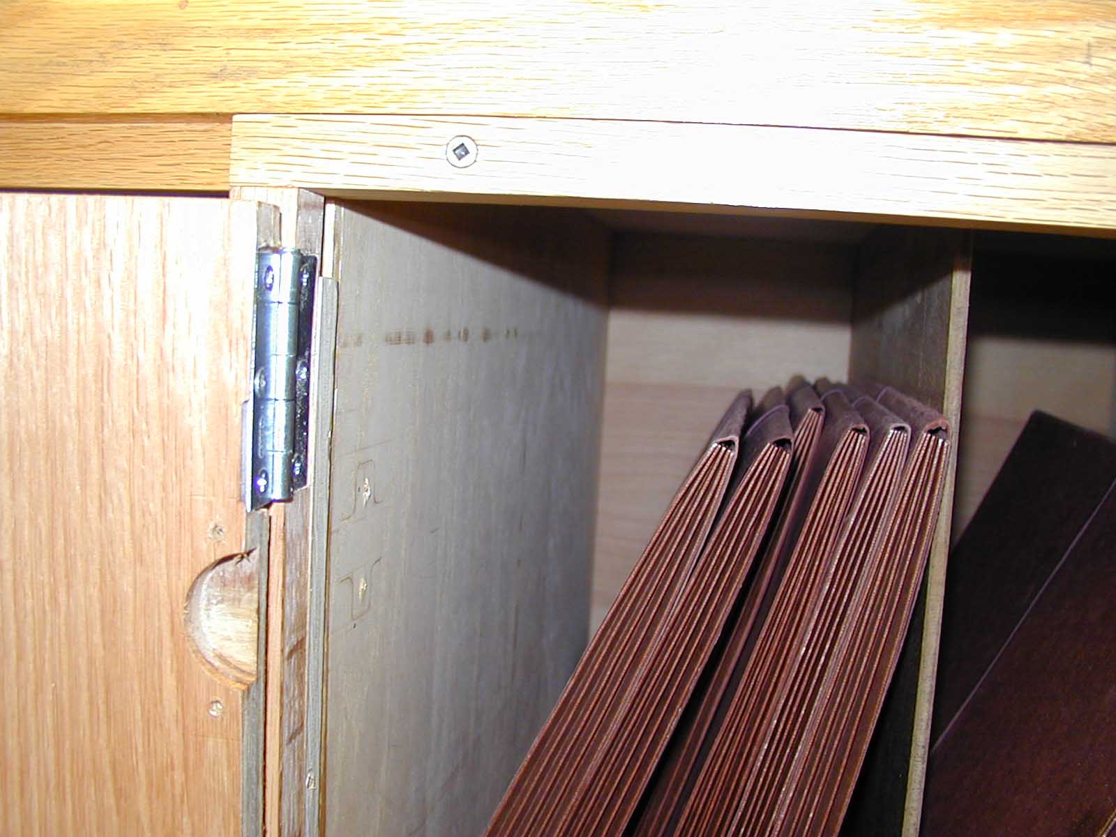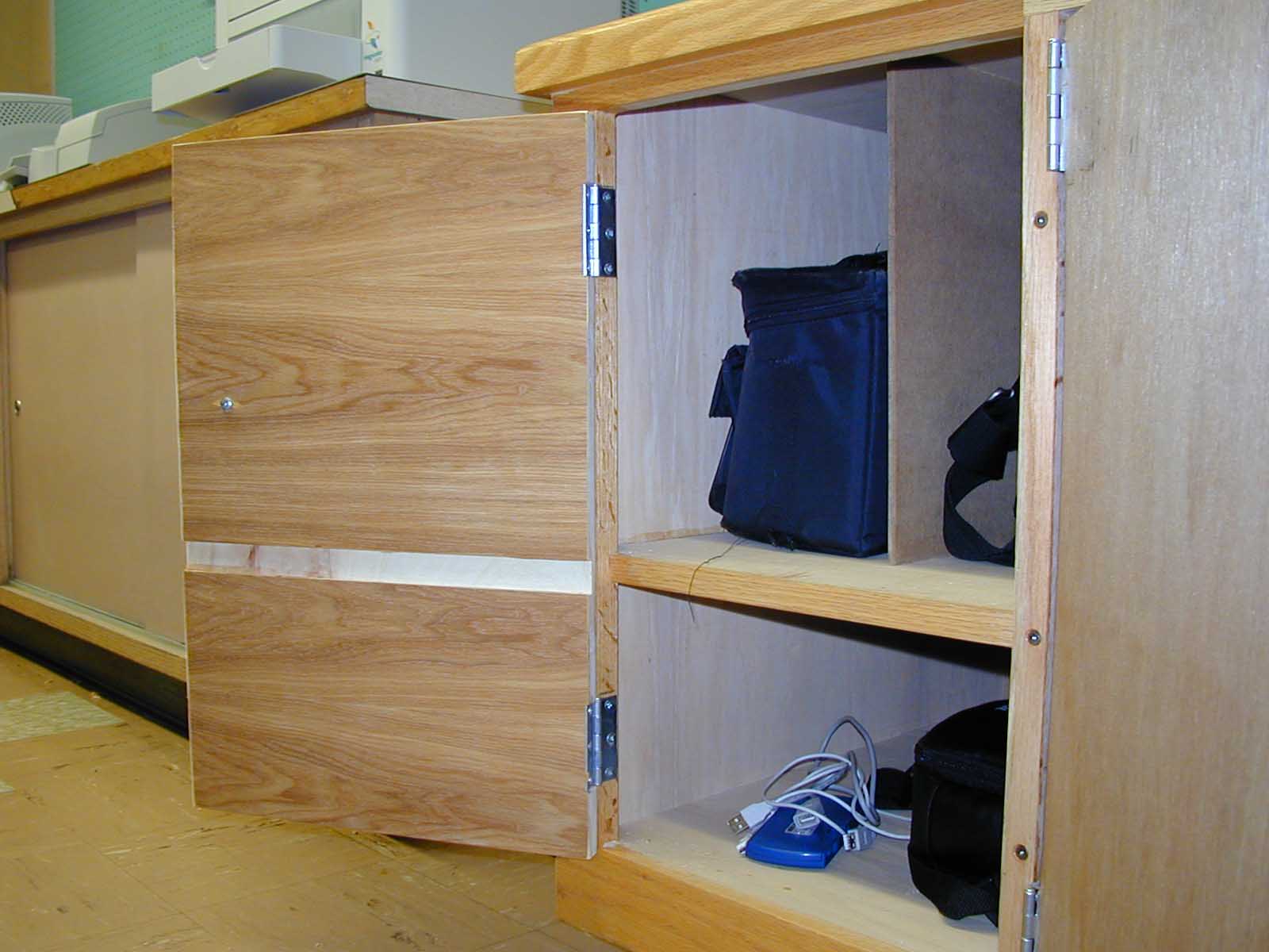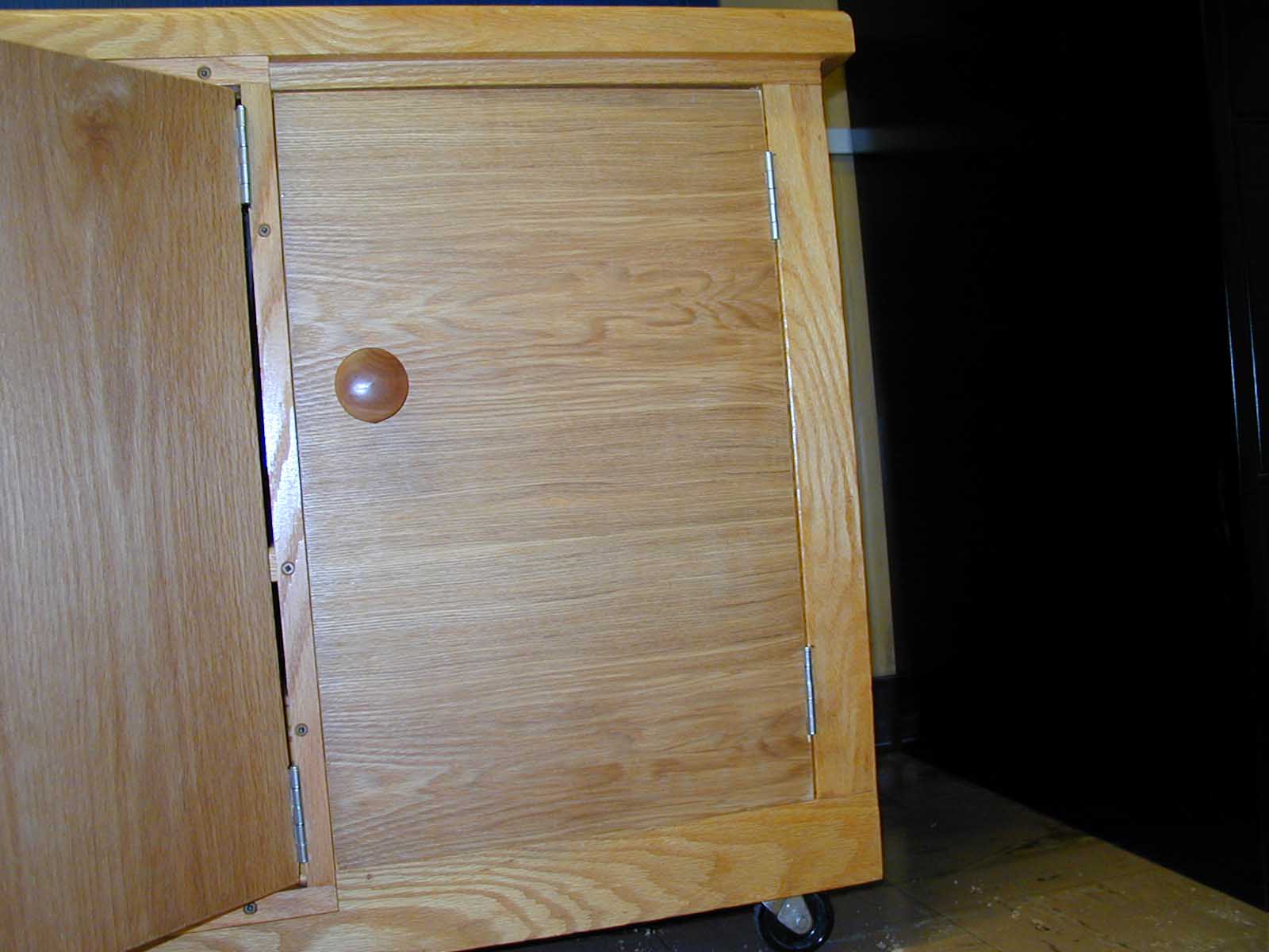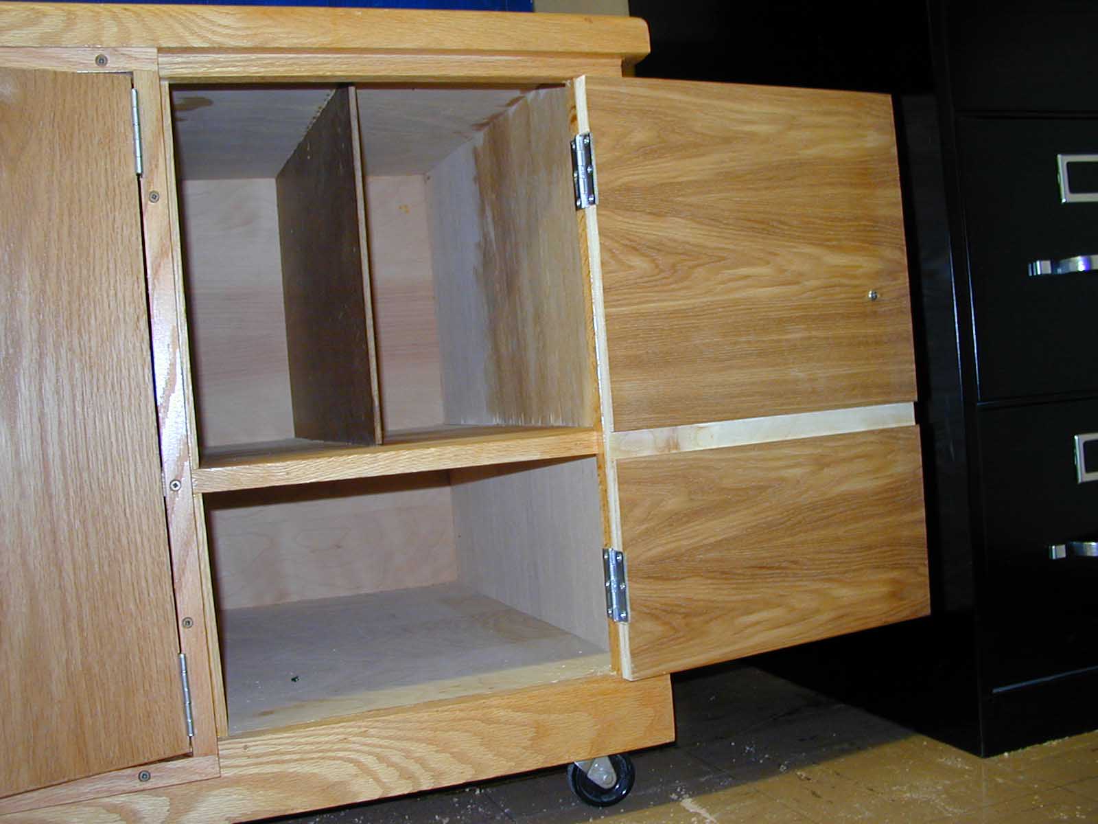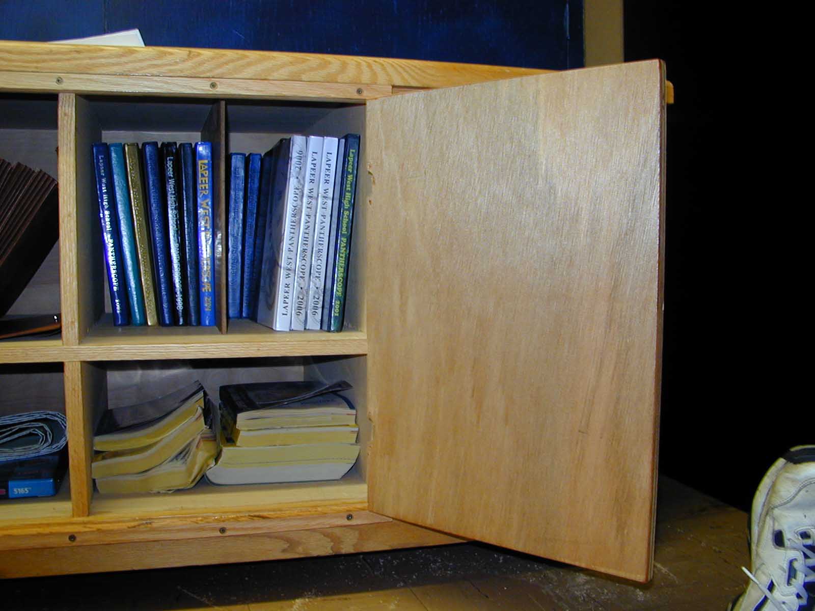 The cabinet was originally built without doors. Two center doors were added after the cabinet was finished; they had hinges that would allow the doors to open at a 90 degree angle to the cabinet. Later the doors were to be modified so that they would open flush to the face of the cabinet. A face frame was created using ¼" oak; butt hinges were attached in place of the original hinges to the doors and the face frame; the face frame was attached to the face of the cabinet. Then two additional flush doors were desired. These doors were mounted with butt hinges so that they would open flush to the cabinet face. A groove was put in each door so that the doors could close without hitting the interior shelf.